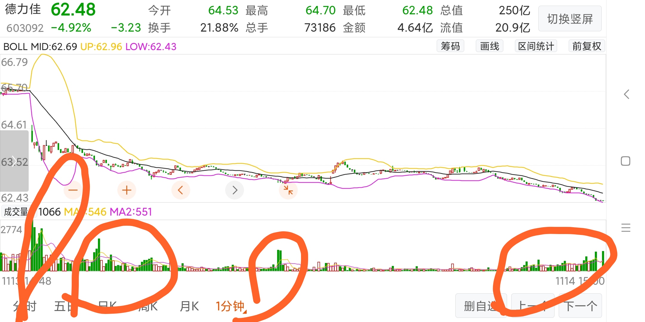 $德力佳(SH603092)$ 我想问问大家,下面这一分钟分时图,我标注的成交量,是主力卖的,还是主力买的,或者说是散户卖的,还是散户买的,有买有卖才有成交量,既然成交量是真实的,那么是谁在卖,又是谁在买,