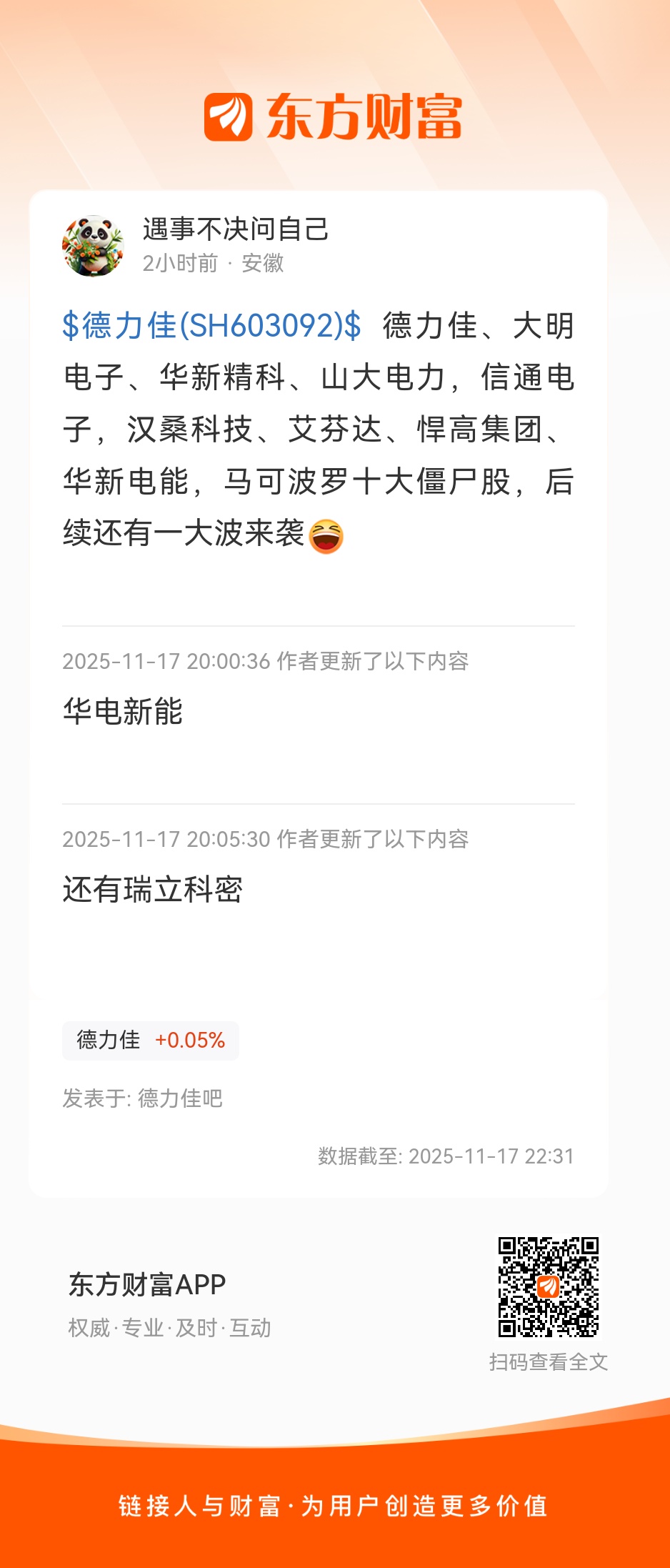 $德力佳(SH603092)$ 德力佳、大明电子、华新精科、山大电力,信通电子,汉桑科技、艾芬达、悍高集团、华新电能,马可波罗十大僵尸股,后续还有一大波来袭