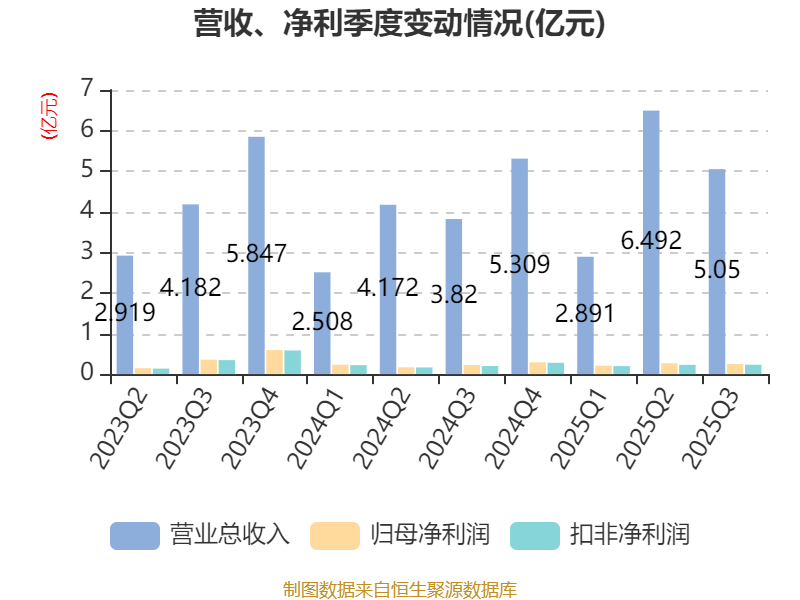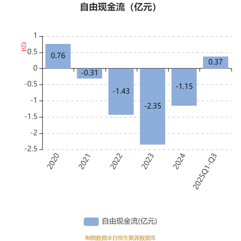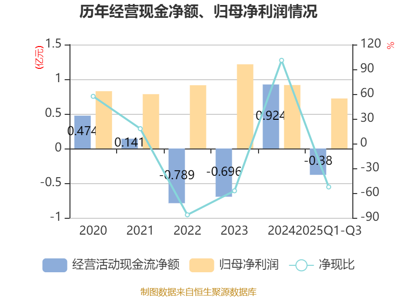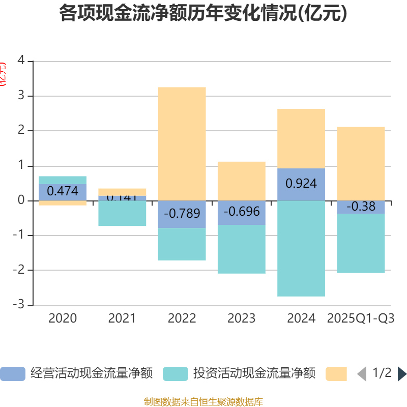 2025年前三季度,公司经营活动现金流净额为-3799.3万元,同比增加2350.87万元;筹资活动现金流净额2.11亿元,同比增加3679.71万元;投资活动现金流净额-1.69亿元,上年同期为-1.32亿元。