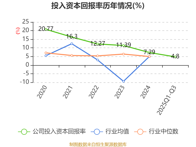 盈利能力方面, 2025年前三季度公司加权平均净资产收益率为6.73%,同比上升0.22个百分点。公司2025年前三季度投入资本回报率为4.8%,较上年同期下降0.32个百分点。