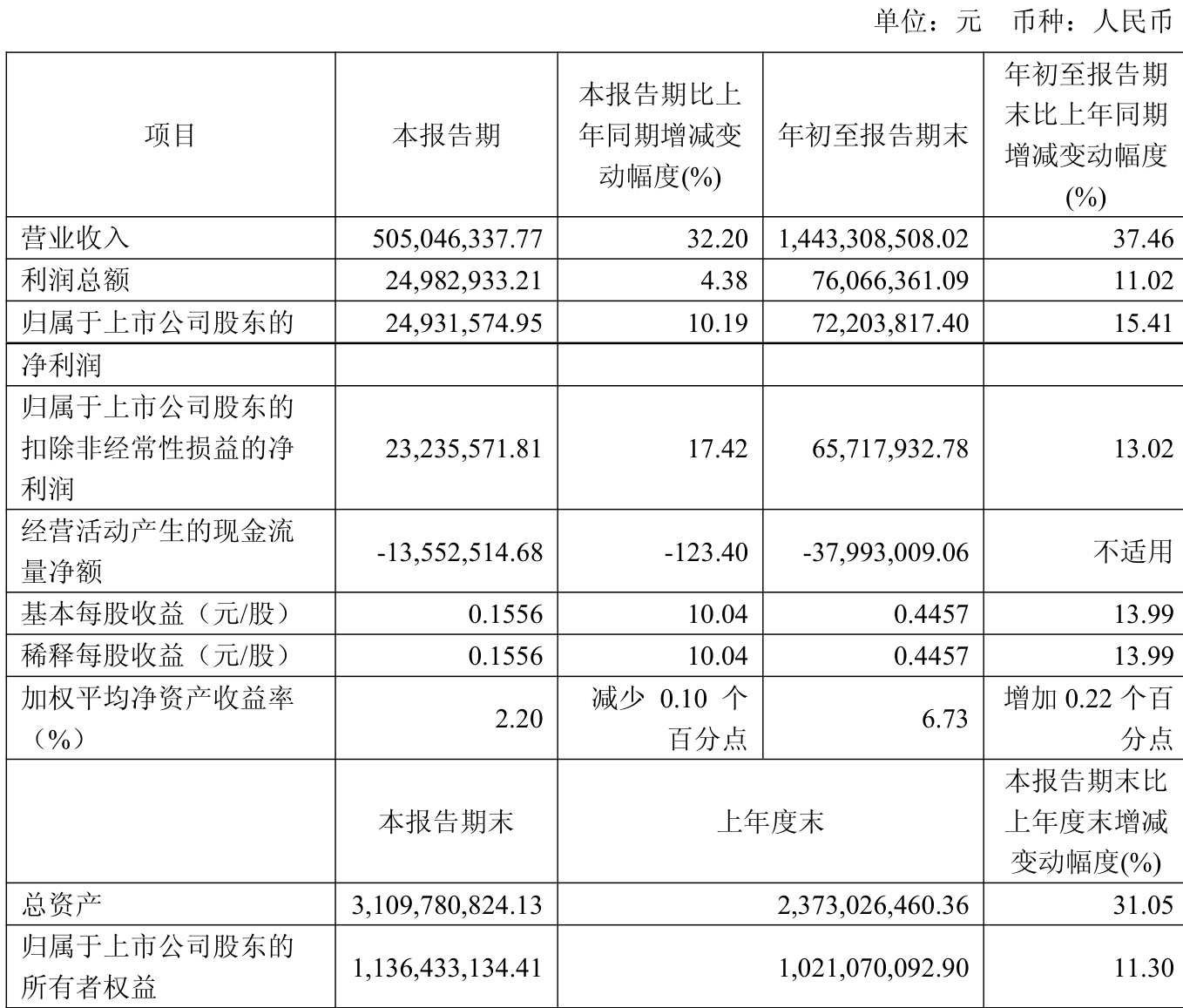 中证智能财讯江苏华辰(603097)10月31日披露2025年第三季度报告。前三季度公司实现营业总收入14.43亿元,同比增长37.46%;归母净利润7220.38万元,同比增长15.41%;扣非净利润6571.79万元,同比增长13.02%;经营活动产生的现金流量净额为-3799.3万元,上年同期为-6150.17万元;报告期内,江苏华辰基本每股收益为0.4457元,加权平均净资产收益率为6.73%。