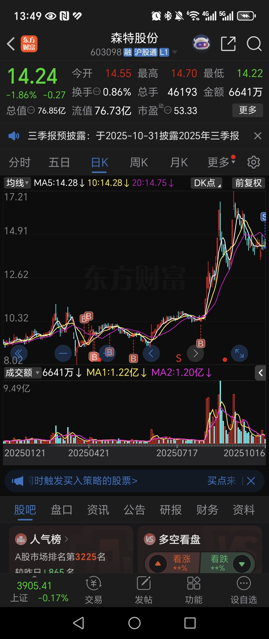 $森特股份(SH603098)$ 4月份买的,今天走了,高点没有走,太遗憾了