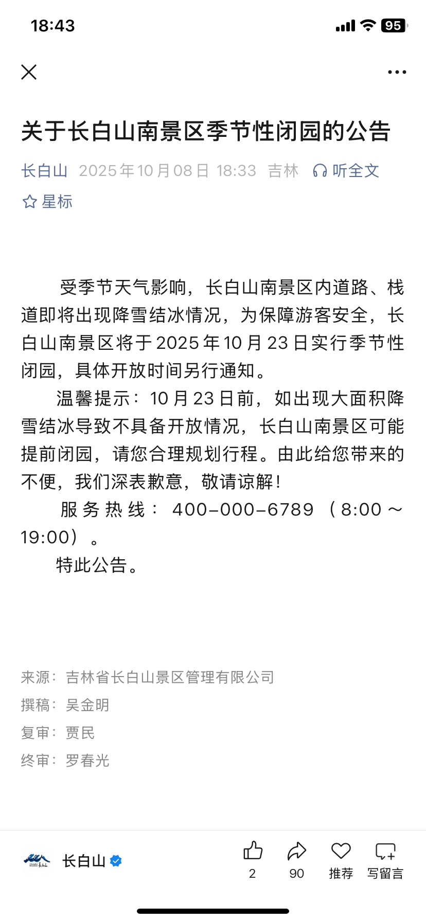 $长白山(SH603099)$ 长白山已经开始下雪了,冰雪经济的春天即将来临