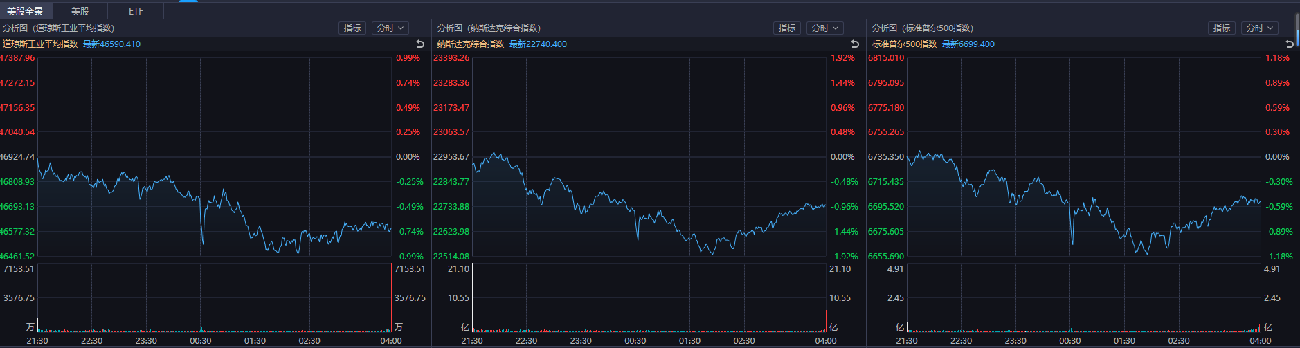 美股收盘了,指数平开,盘中中等偏大幅度跳水,尾盘跌幅收窄。