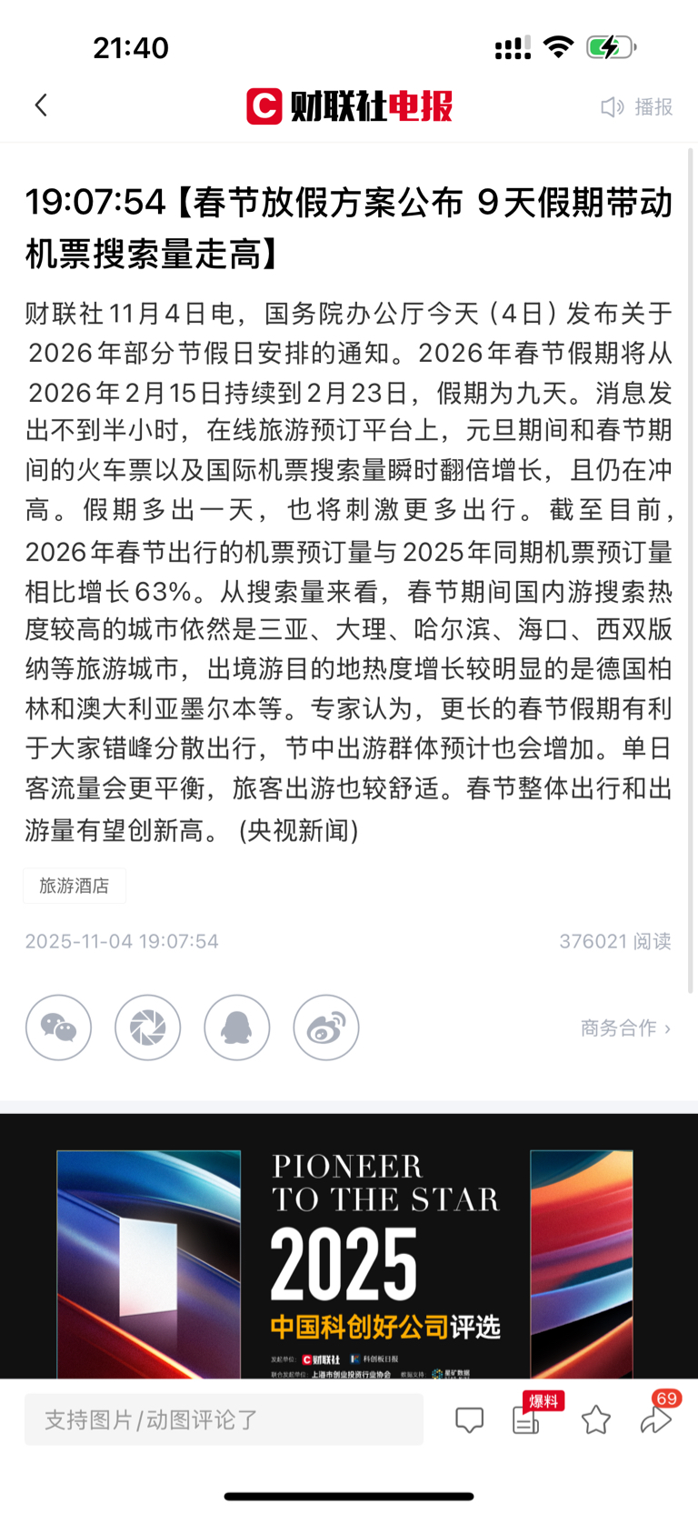 $长白山(SH603099)$ 春节九天假,清醒一下,这是今天最热的消息,而且是全民消息,不止是对于咱们股民。什么核反应,芯片,福建,在这个全民热度下得往边上靠一靠,外面炮火连天,文旅相对低位。冬天要么海南,要么东北,海南因为封关已经热了很多次,今年东北文旅还没开始真正发力。不如在这个文旅酒店加冰雪经济的老龙身上呆住,走不出来大行情做做T不比在外面挨打好的多啊,兄弟们来吧,这还算是片净土。