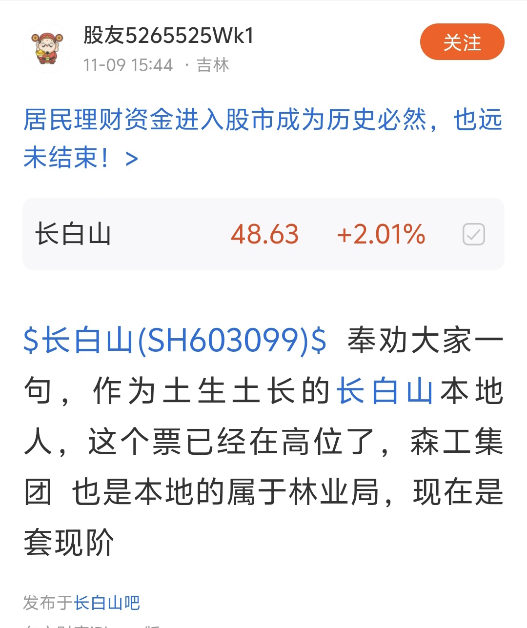 想问一下这个哥们,作为一个长白山人,为何不在6块的时候入,到现在翻了十倍,却高位