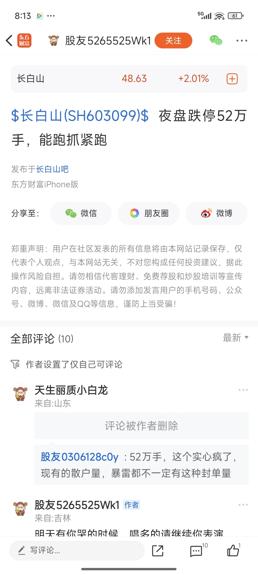 $长白山(SH603099)$ 这个人怎么还删评论啊