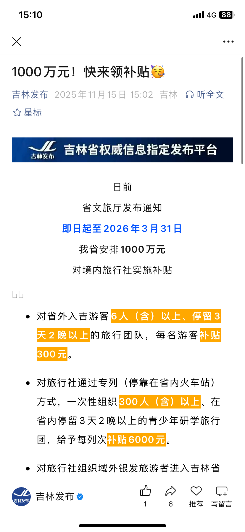 $长白山(SH603099)$ 吉林的旅游补贴来了,今年必须去吉林旅游一下,吉林名字很吉利