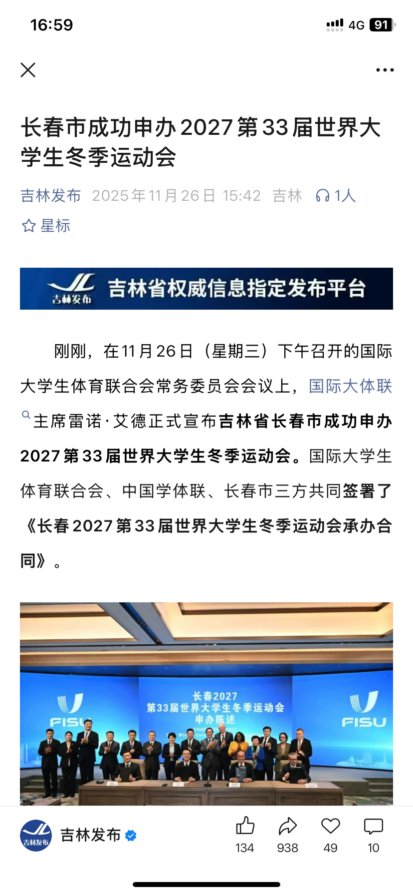$长白山(SH603099)$ 吉林长春成功申办2027年大学生冬季运动会