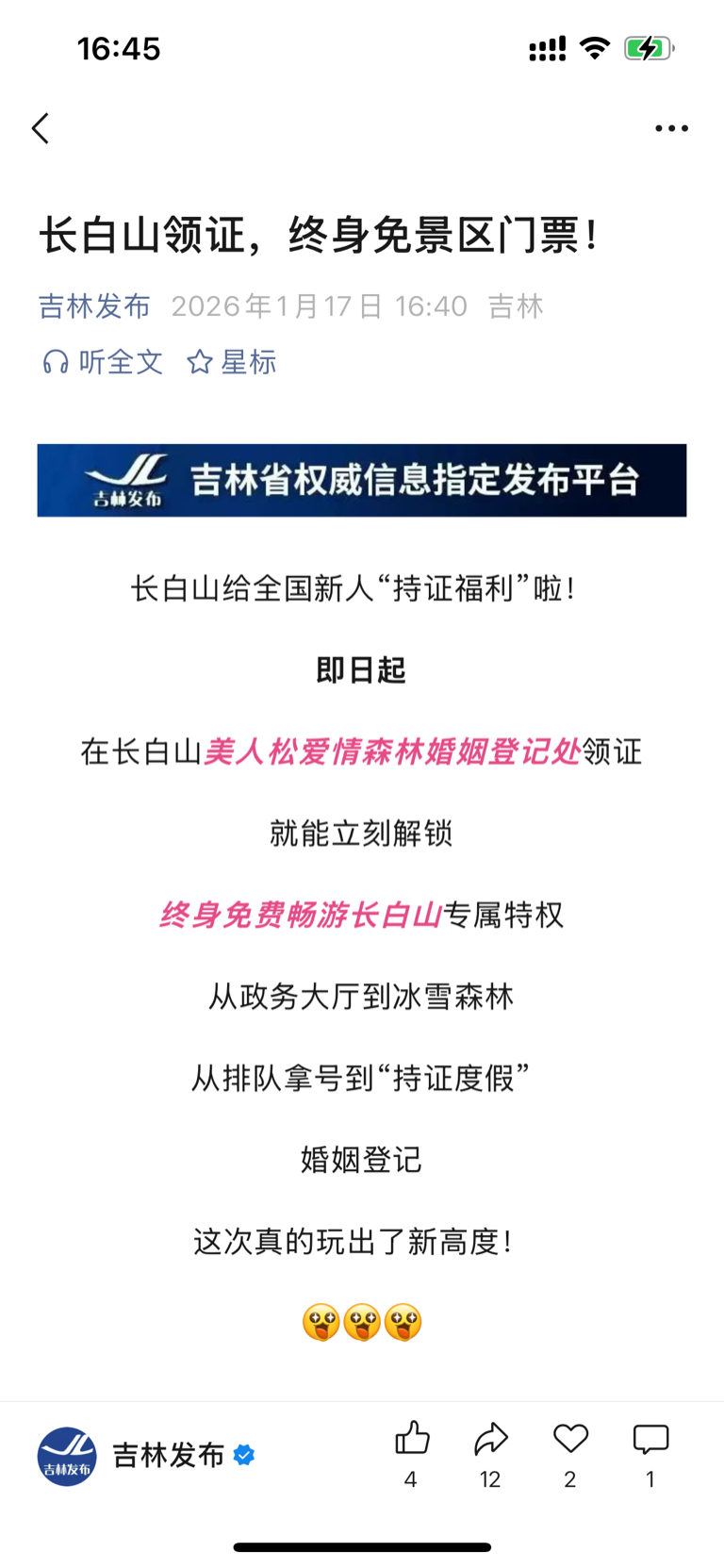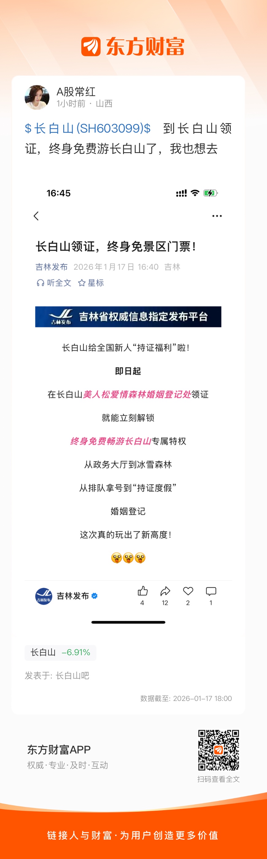 $长白山(SH603099)$  到长白山领证,终身免费游长白山了,我也想去
