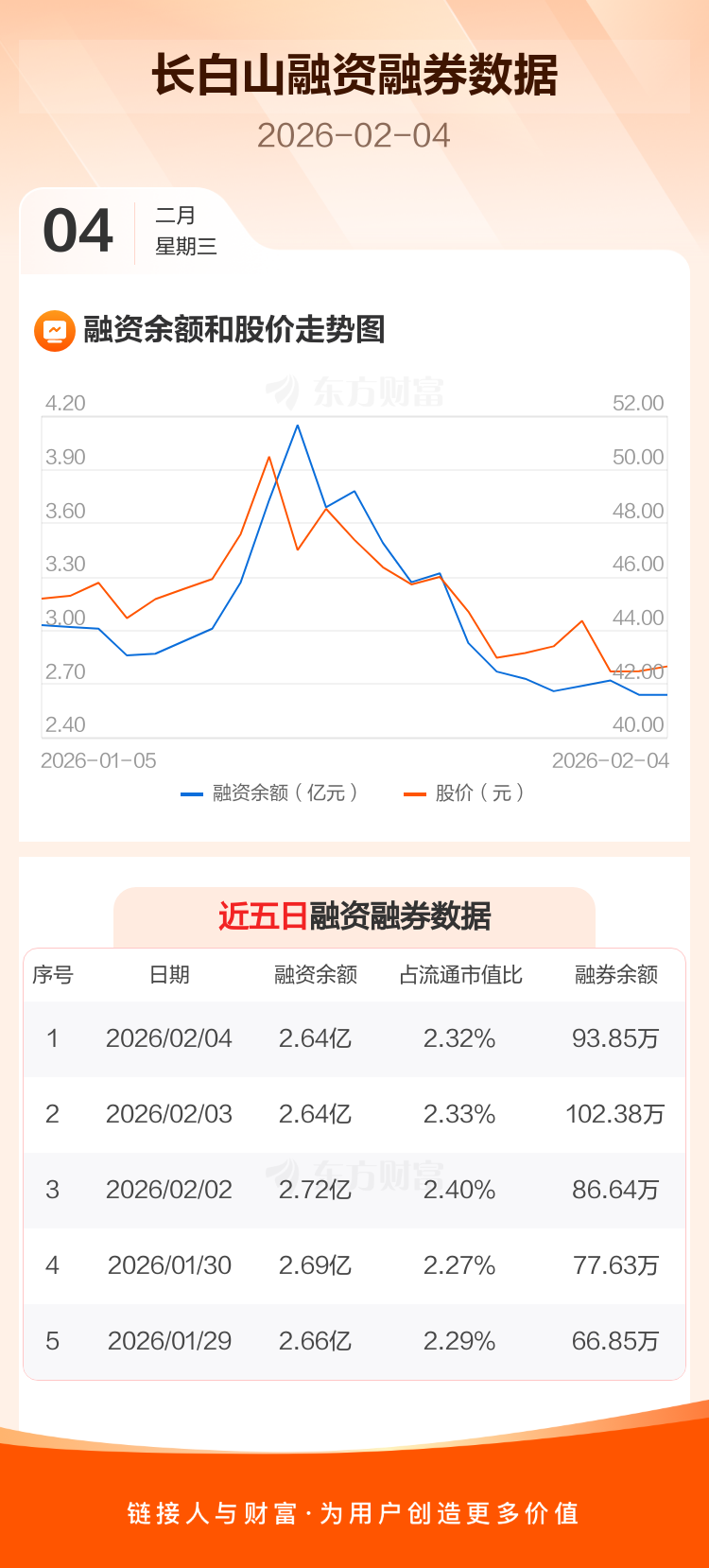 交易所最新数据显示,长白山于2026年2月4日获融资买入1265.01万元,融资偿还1251.70万元,当日融资净买入13.31万元。目前,该股融资余额2.64亿,占流通市值比例为2.32%。