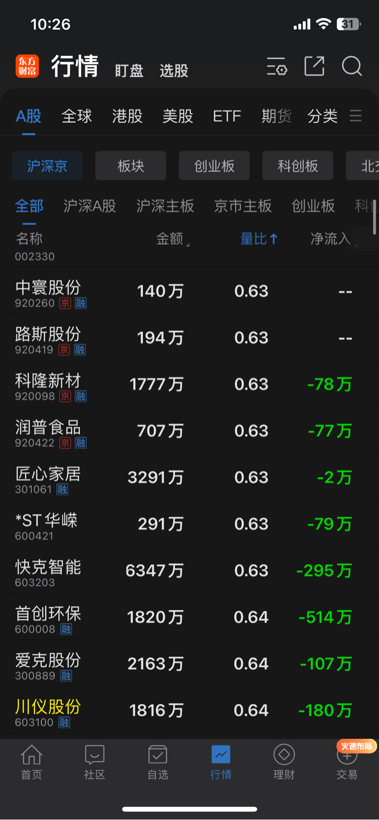 加上停牌的,ST的,整个市场的量比排行80多倒数80多,能涨都有了
