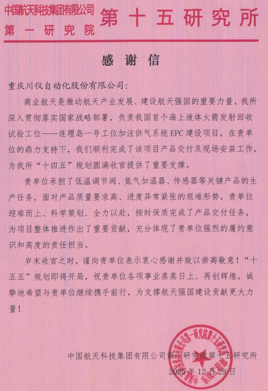 $川仪股份(SH603100)$ 商业航天唯一被官方感谢表扬的供应商