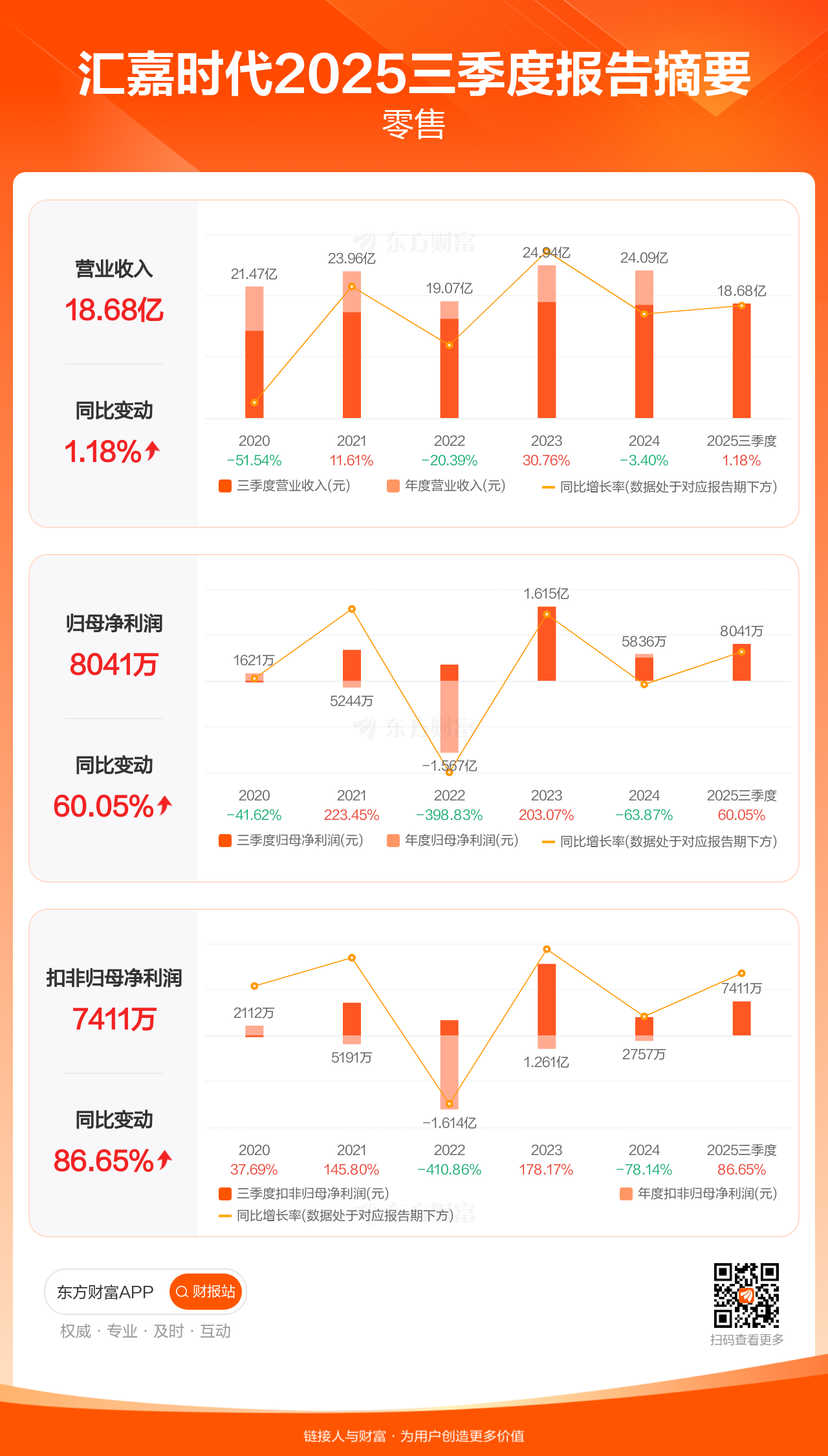汇嘉时代10月30日发布2025年三季报显示,公司前三季实现营业收入18.68亿元,同比增长1.18%;归母净利润8041.24万元,同比增长60.05%;扣非归母净利润7410.67万元,同比增长86.65%。