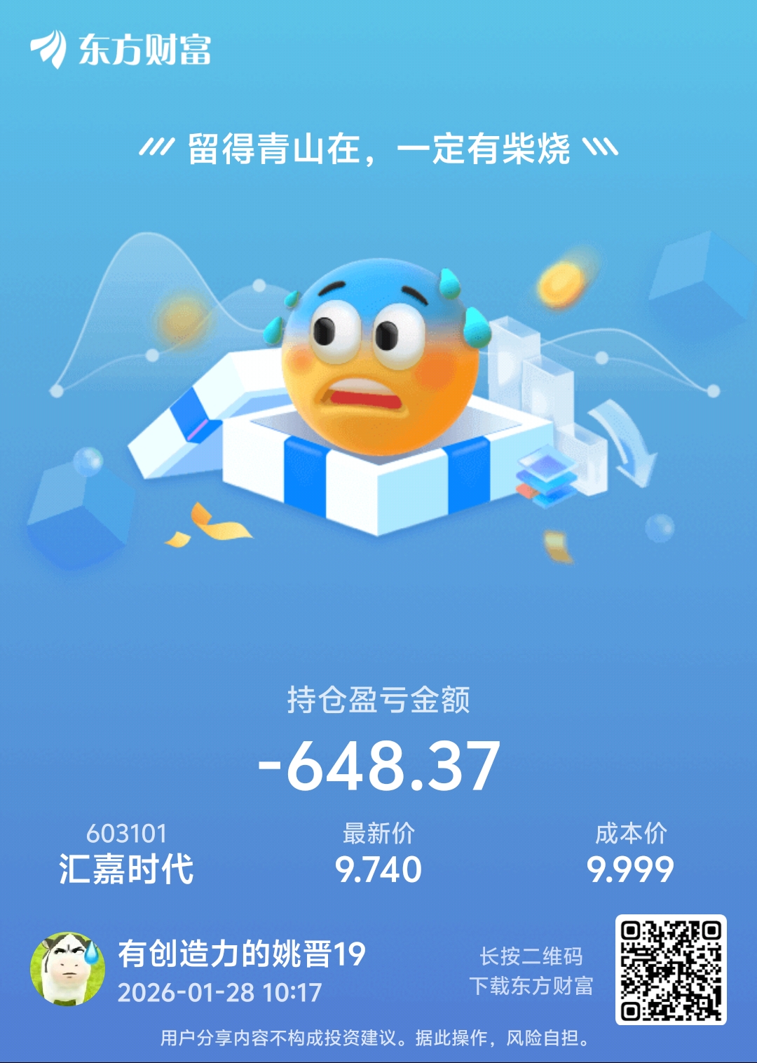 温馨提示: 1.根据《证券法》规定,禁止编造、传播虚假信息或者误导性信息,扰乱证券市场;2.用户在本社区发表的所有资料、言论等仅代表个人观点,与本网站立场无关,不对您构成任何投资建议。用户应基于自己的独立判断,自行决定证券投资并承担相应风险。《东方财富社区管理规定》