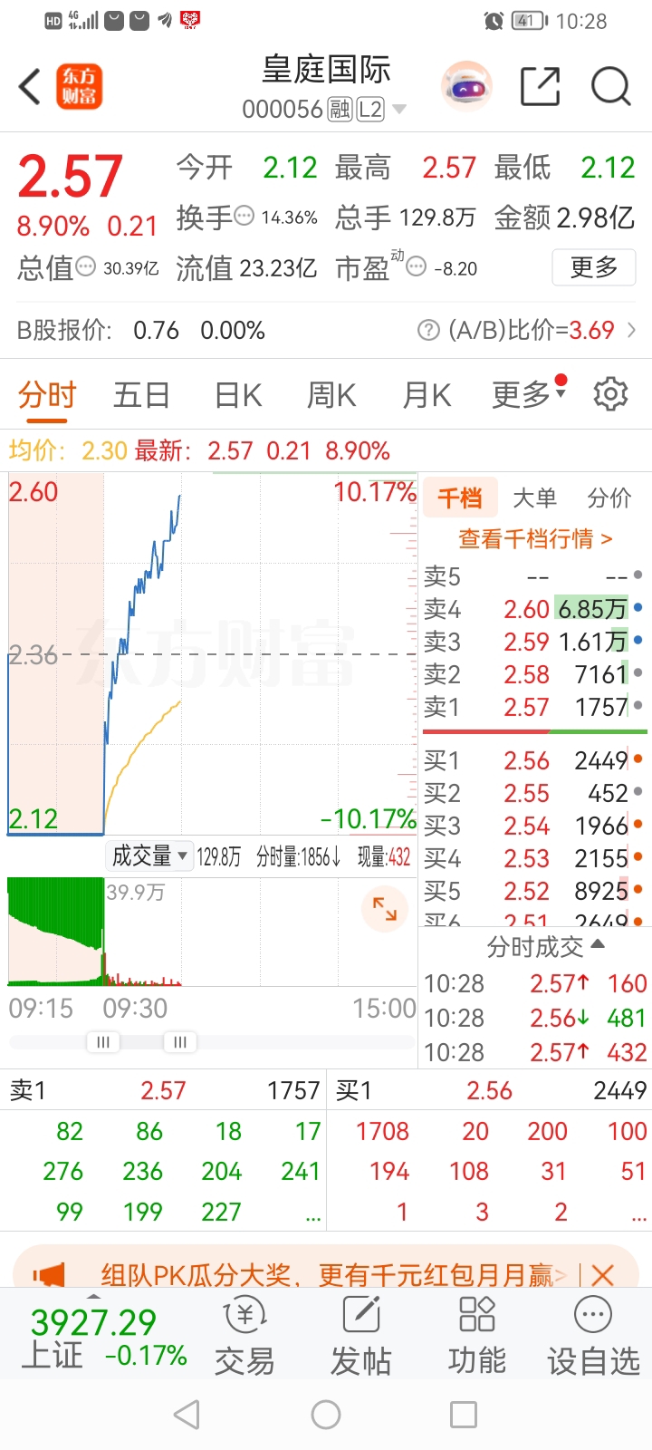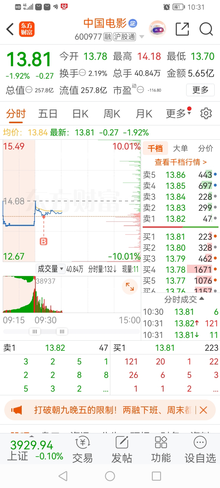 $横店影视(SH603103)$ $皇庭国际(SZ000056)$ $中国电影(SH600977)$ 早上想买皇庭国际和中国电影,因为看到皇庭国际发了有退市风险公告所以不敢买,买了中国电影它不涨,没买皇庭国际它差点地天板了!中国电影的表现太差劲了,连一支快要退市的股都不如!!!