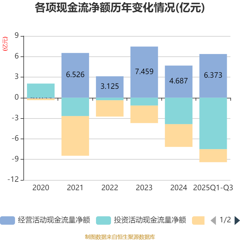 2025年前三季度,公司经营活动现金流净额为6.37亿元,同比增长38.32%;筹资活动现金流净额-1.89亿元,同比增加672.08万元;投资活动现金流净额-7.51亿元,上年同期为-1.25亿元。