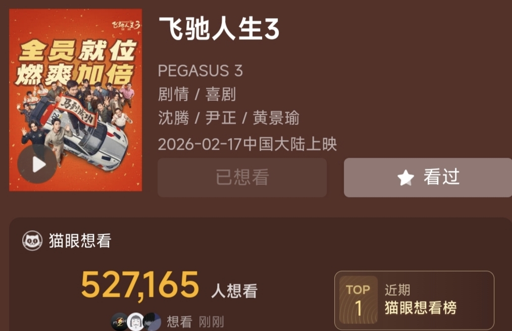 电影飞驰人生3想看破52万了,大家继续点击呀!多点今天拉涨打败电影惊蛰无声连续涨