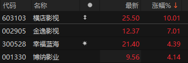 上证报中国证券网讯 1月30日早盘,影视动漫概念走强。9时59分,横店影视涨停,金逸影视涨超7%。