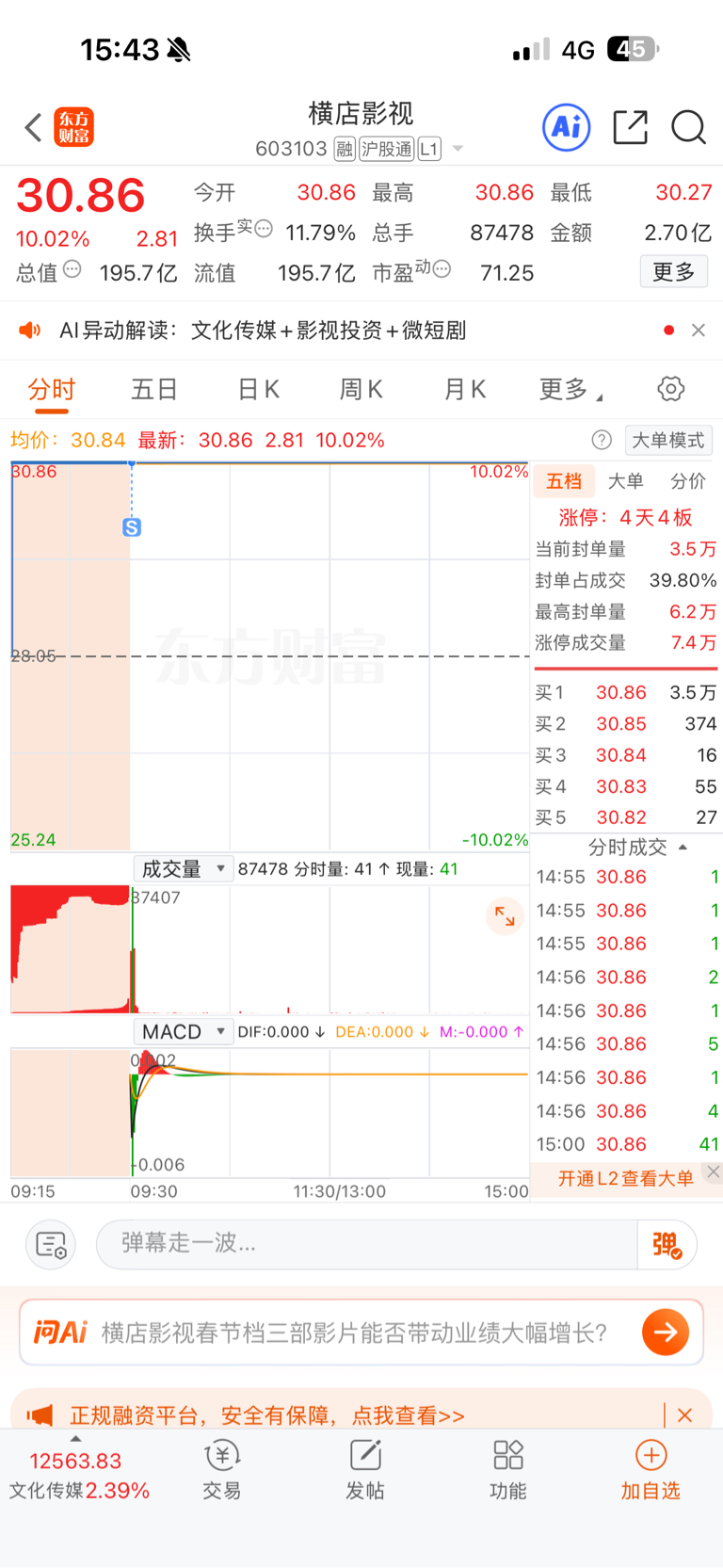 $横店影视(SH603103)$ #炒股日记# #复盘记录# 脑子一热,卖飞了,T字板都能被我卖飞,无语了,低级错误。想买的另一只买不进,空仓等吧。