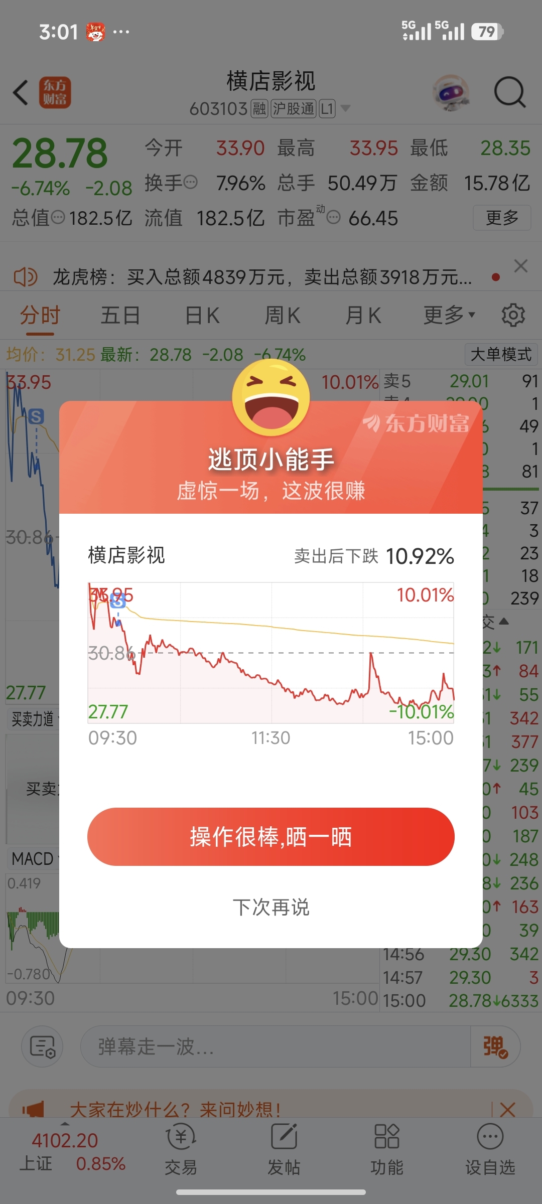 $横店影视(SH603103)$ 八个点格局了一下,看会不会封板。到4个点的时候止盈出来了