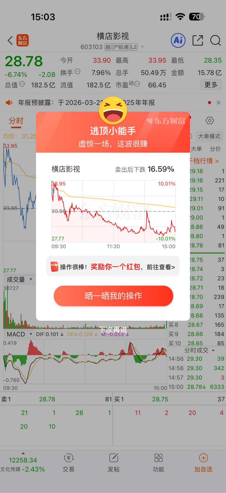 $横店影视(SH603103)$ 感谢主力,5天吃了60个点,可以过个好年了,祝车上的朋友继续发财