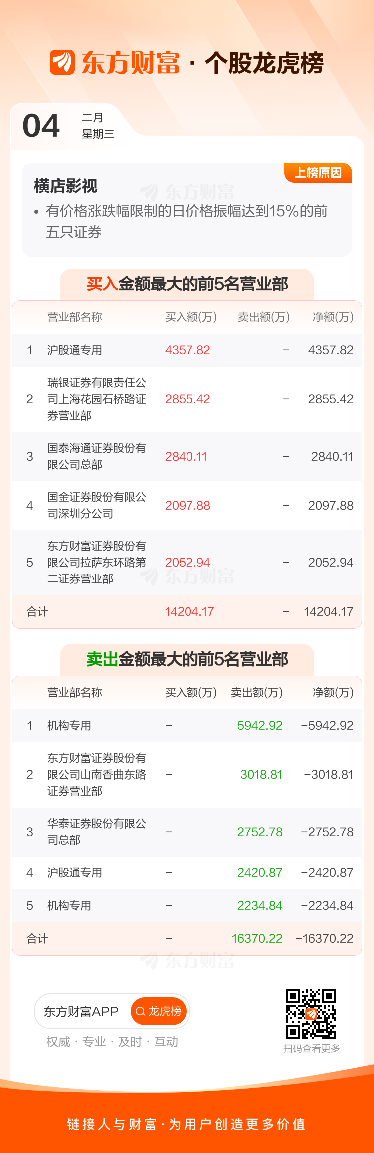 交易所2026年2月4日公布的交易公开信息显示,横店影视因成为有价格涨跌幅限制的日价格振幅达到15%的前五只证券上榜。横店影视当日收报28.78元,涨跌幅-6.74%,偏离值19.75%,换手率7.96%,成交额15.78亿。