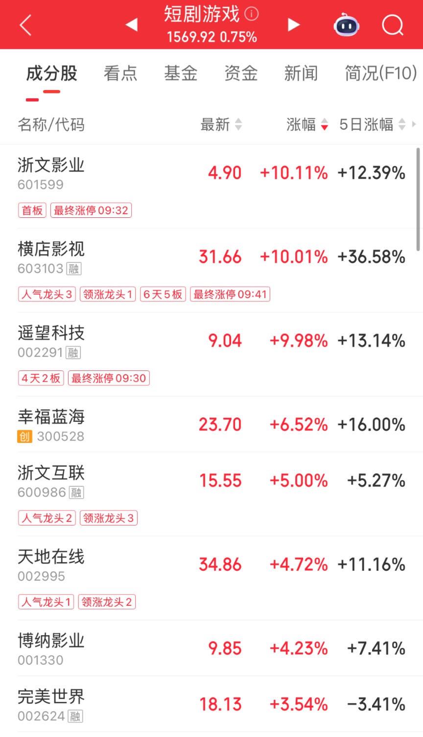 早盘,短剧游戏板块活跃。横店影视(603103)“6天5板”,遥望科技、浙文影业涨停,幸福蓝海、浙文互联、天地在线等跟涨。