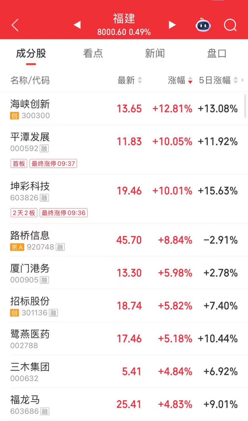 此外,福建板块迅速拉升,平潭发展、坤彩科技涨停,海峡创新涨超12%,路桥信息、厦门港务等跟涨。