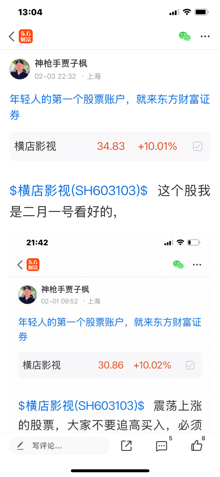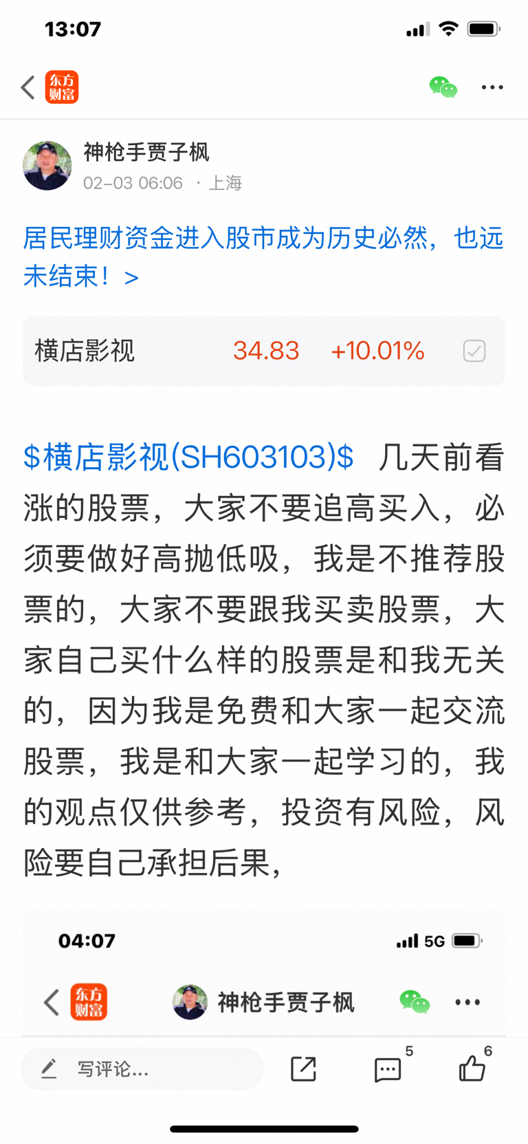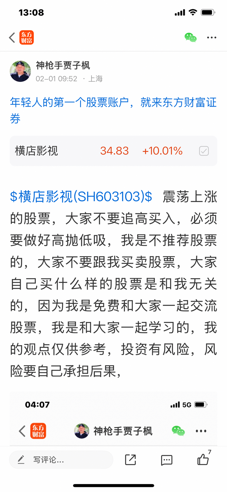 $横店影视(SH603103)$ 这个股是二月一号发表文章看涨的股票,大家不要追高买入,必须要做好高抛低吸,我是不推荐股票的,大家不要跟我买卖股票,大家自己买什么样的股票是和我无关的,因为我是免费和大家一起交流股票,我是和大家一起学习的,投资有风险,风险要自己承担后果,