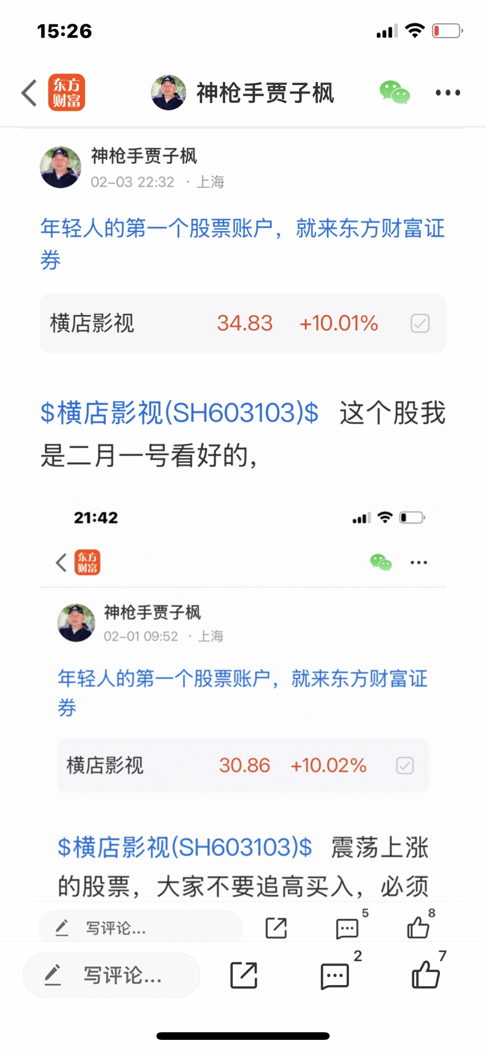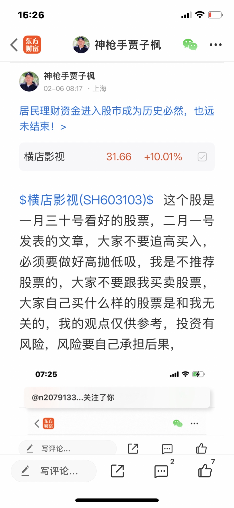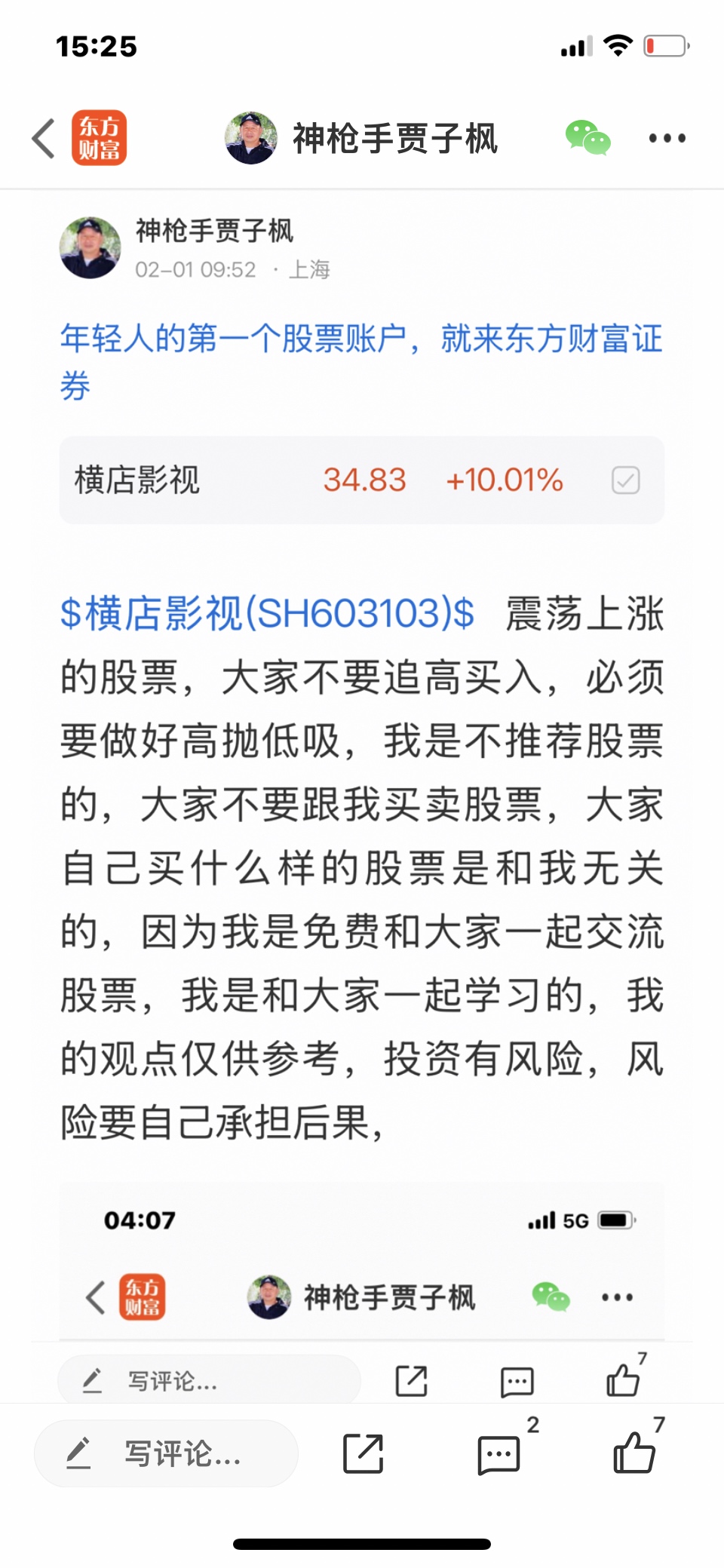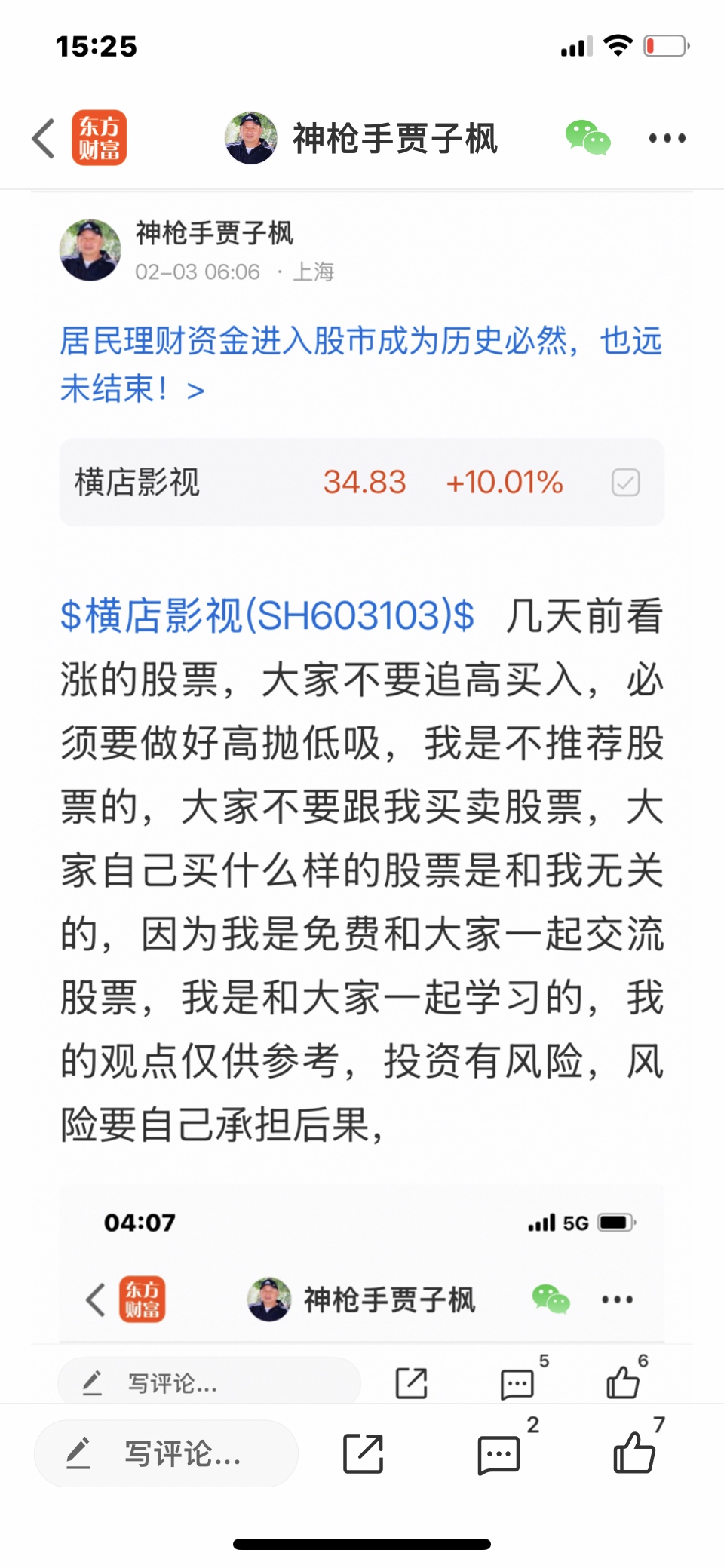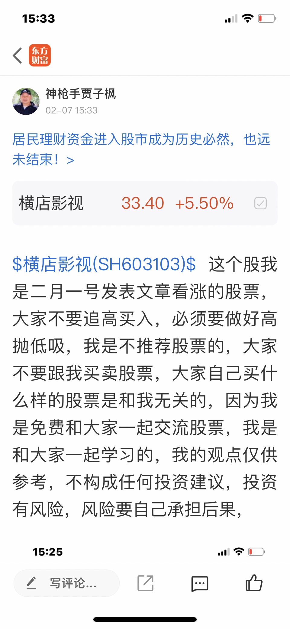 $横店影视(SH603103)$ 这个股是我二月一号发表文章看涨的股票,大家不要追高买入,必须要做好高抛低吸,我是不推荐股票,大家不要跟我买卖股票,大家自己买什么样的股票是和我无关的,因为我是免费和大家一起交流股票,我是和大家一起学习的,我的观点仅供参考,不构成任何投资建议,投资有风险,风险要自己承担后果,
