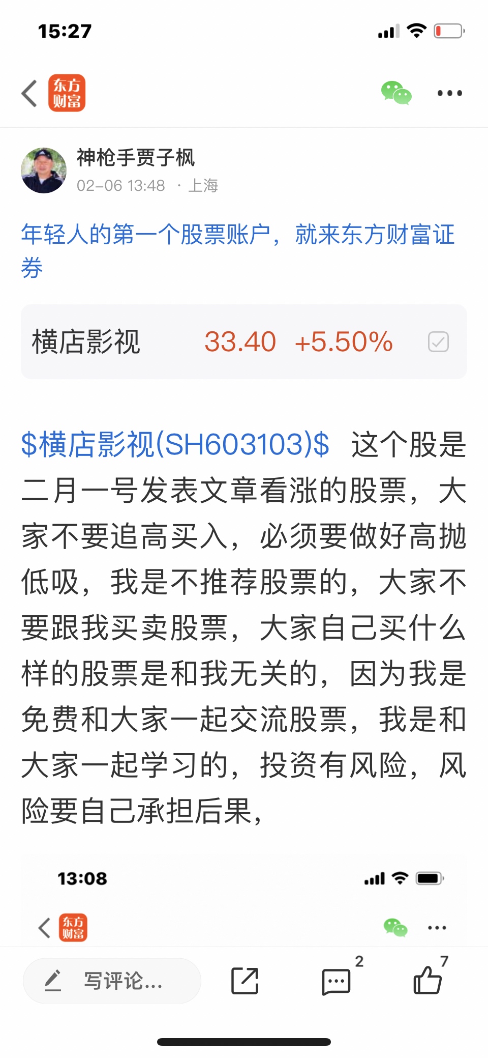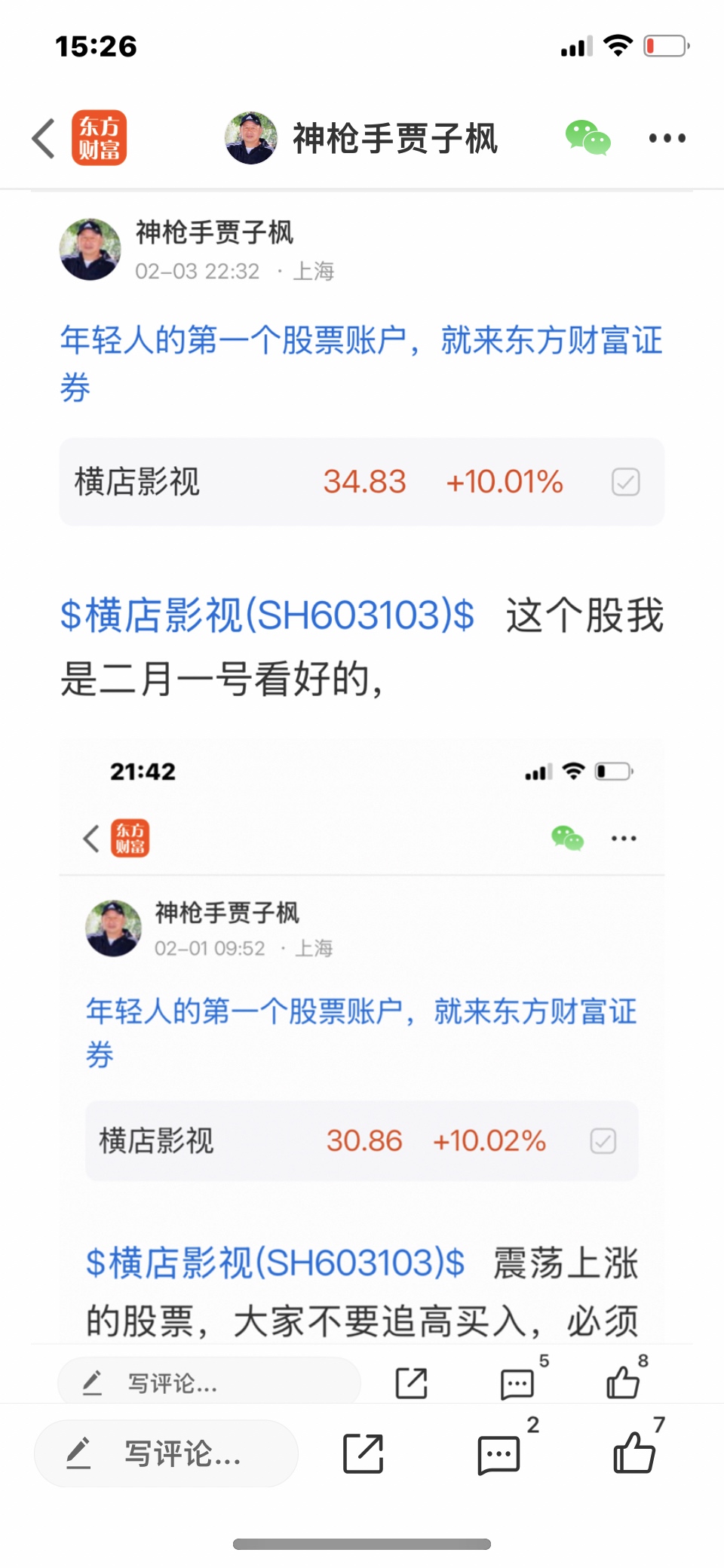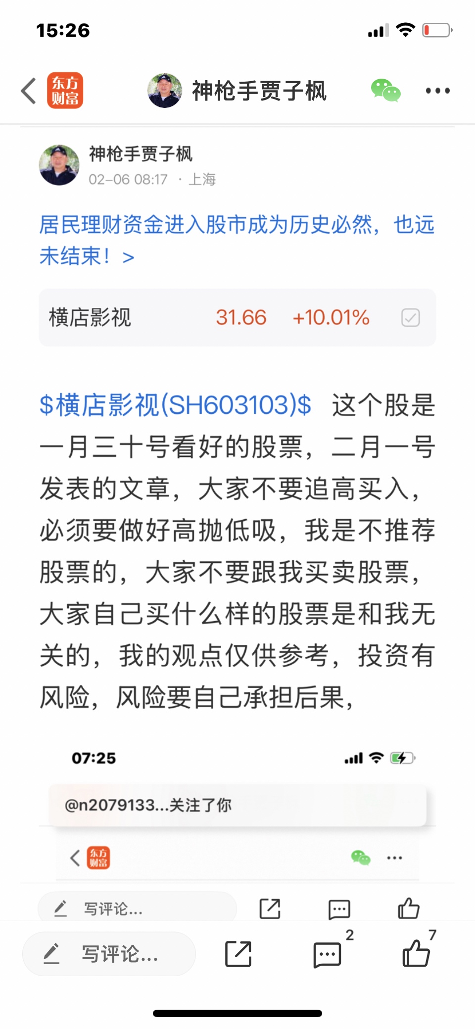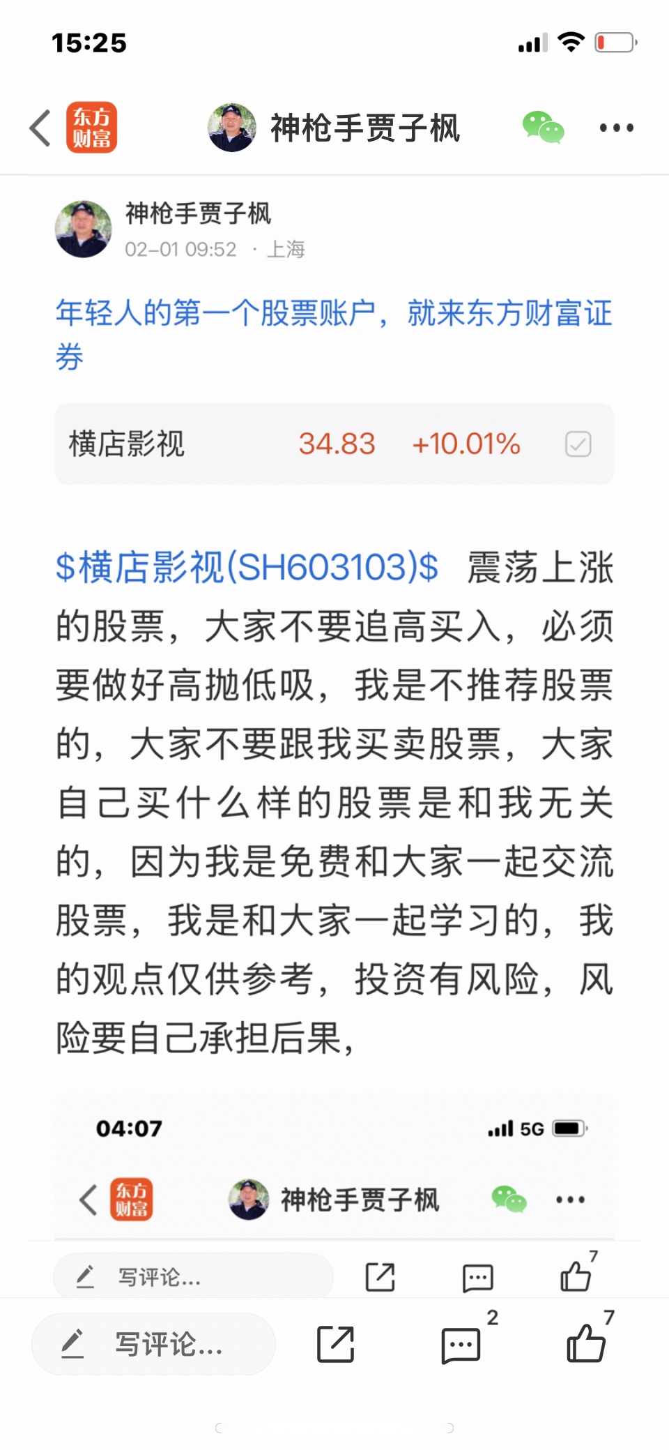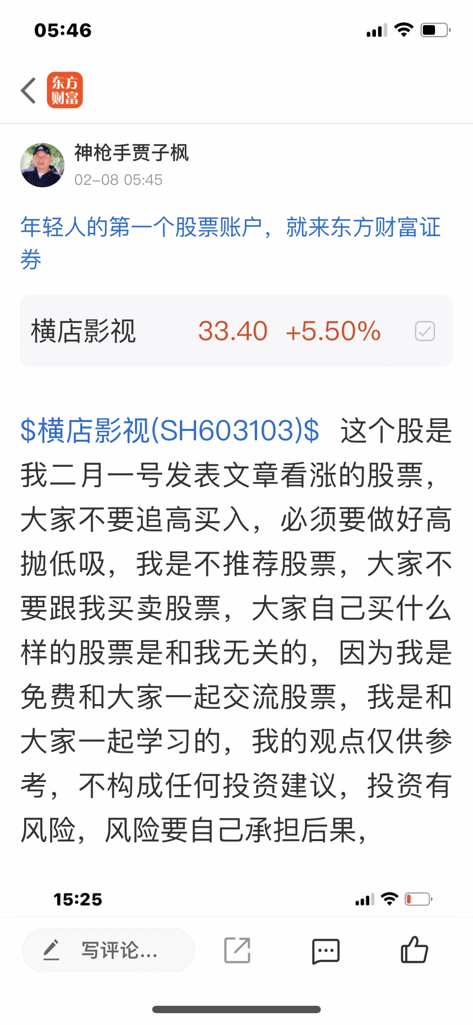 $横店影视(SH603103)$ 二月一号发表文章看涨的股票,大家不要追高买入,必须要做好高抛低吸,我齿不推荐股票的,大家不要跟我买卖股票,大家自己买什么样的股票是和我无关的,因为我是免费和大家一起交流股票,我是和大家一起学习的,我的观点仅供参考,投资有风险,风险要自己承担后果,