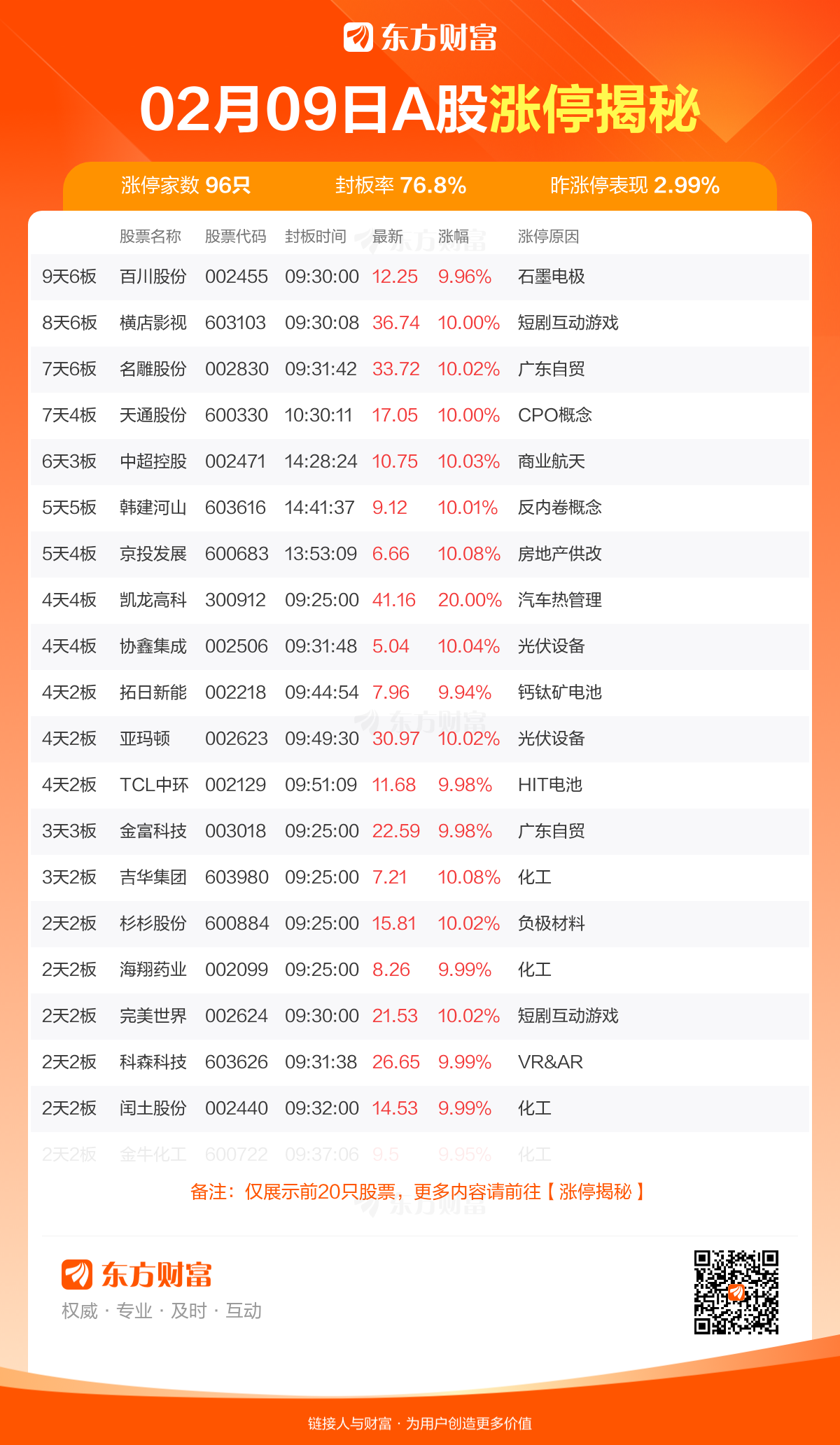 杉杉股份:公司公告称,控股股东杉杉集团及其全资子公司宁波朋泽贸易有限公司、杉杉集团管理人与重整投资人安徽皖维集团有限责任公司和宁波金融资产管理股份有限公司签署了《重整投资协议》。若本次重整成功,公司的控制权将发生变更,公司控股股东将变更为皖维集团,公司实际控制人将变更为安徽省国资委。 永太科技:公司公告称,拟以发行股份方式购买宁德时代持有的永太高新25%股权并募集配套资金。公司现持有该标的公司75%股权。本次交易完成后,宁德时代将成为公司股东。公司股票自2026年2月9日开市起开始停牌。公司预计在不超过10个交易日的时间内披露本次交易方案。 神剑股份:公司发布异动公告,公司关注到目前市场对公司商业航天业务关注度较高,公司航空航天类产品目前主要包括飞机雷达罩、飞机油管及零部件、卫星复合材料零部件、地面接收装置及运输设备柜等。公司2025年第三季度报告营业总收入为18.34亿元,其中航空航天类收入为1.39亿元,占公司营业总收入比例为7.59%。截至2025年底,公司商业航天应用领域收入为371.24万元(暂估),占公司2025年度营业总收入比例不足1%,占比较小。 安路科技:公司公告称,公司于近日收到股东国家大基金、安芯合伙、安路芯合伙、芯添合伙、深圳思齐、士兰微、士兰创投分别出具的关于股份减持计划的告知函,国家大基金拟减持不超过801.7万股,占公司总股本的比例不超过2%。安芯合伙拟减持不超过365.27万股,占公司总股本的比例不超过0.91%;安路芯合伙拟减持不超过14.81万股,拟占公司总股本的比例不超过0.0369%;芯添合伙拟减持不超过20.77万股,占公司总股本的比例合计不超过0.05%。深圳思齐拟减持不超过200.42万股,占公司总股本的比例合计不超过0.50%。士兰微拟减持不超过100.21万股,占公司总股本的比例合计不超过0.25%;士兰创投拟减持不超过100.21万股,占公司总股本的比例合计不超过0.25%。 赛力斯:公司公告称,公司于2月8日与重庆市沙坪坝区人民政府签署《合作协议》,公司以蓝电汽车相关存量资产剥离出资设立标的公司,沙坪坝区政府组建或引入有限合伙企业(或基金)与其他投资人及经营团队以现金对标的公司增资。各方出资后,沙坪坝区政府持股约33.5%,公司及公司指定主体持股约32%,标的公司搭建员工持股平台持股约16%。 明冠新材:公司公告称,决定终止与肥东县人民政府签订的太阳能背板及功能性膜生产基地项目投资合作协议。该项目总投资预计50亿元,目前公司正积极配合肥东县政府办理定制物业的竣工验收等后续工作。自2023年第四季度起,光伏行业已出现产能过剩苗头,产业链产品价格竞争随之加剧,行业处于产业调整周期,2024年和2025年度出现光伏行业普遍亏损。公司管理层在对市场变化认真分析及谨慎研判的基础上,考虑行业内卷导致光伏封装材料盈利能力逐步下降,加之2025年行业竞争白热化且周期性调整尚未呈现明显好转,若继续推进明冠合肥项目,将不可避免地推高公司整体运营成本。市场消息