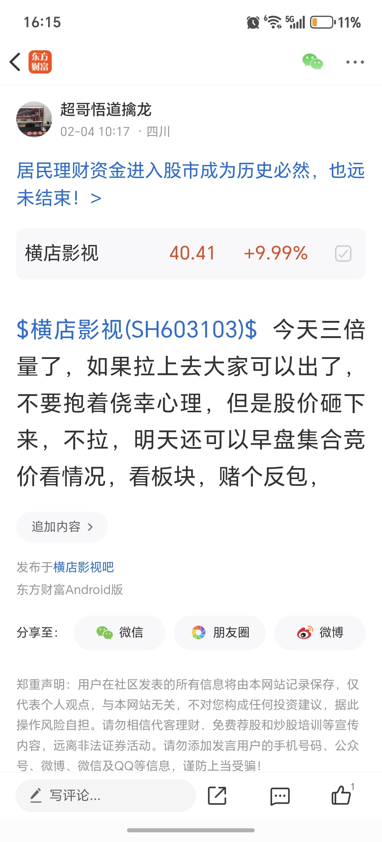 温馨提示: 1.根据《证券法》规定,禁止编造、传播虚假信息或者误导性信息,扰乱证券市场;2.用户在本社区发表的所有资料、言论等仅代表个人观点,与本网站立场无关,不对您构成任何投资建议。用户应基于自己的独立判断,自行决定证券投资并承担相应风险。《东方财富社区管理规定》