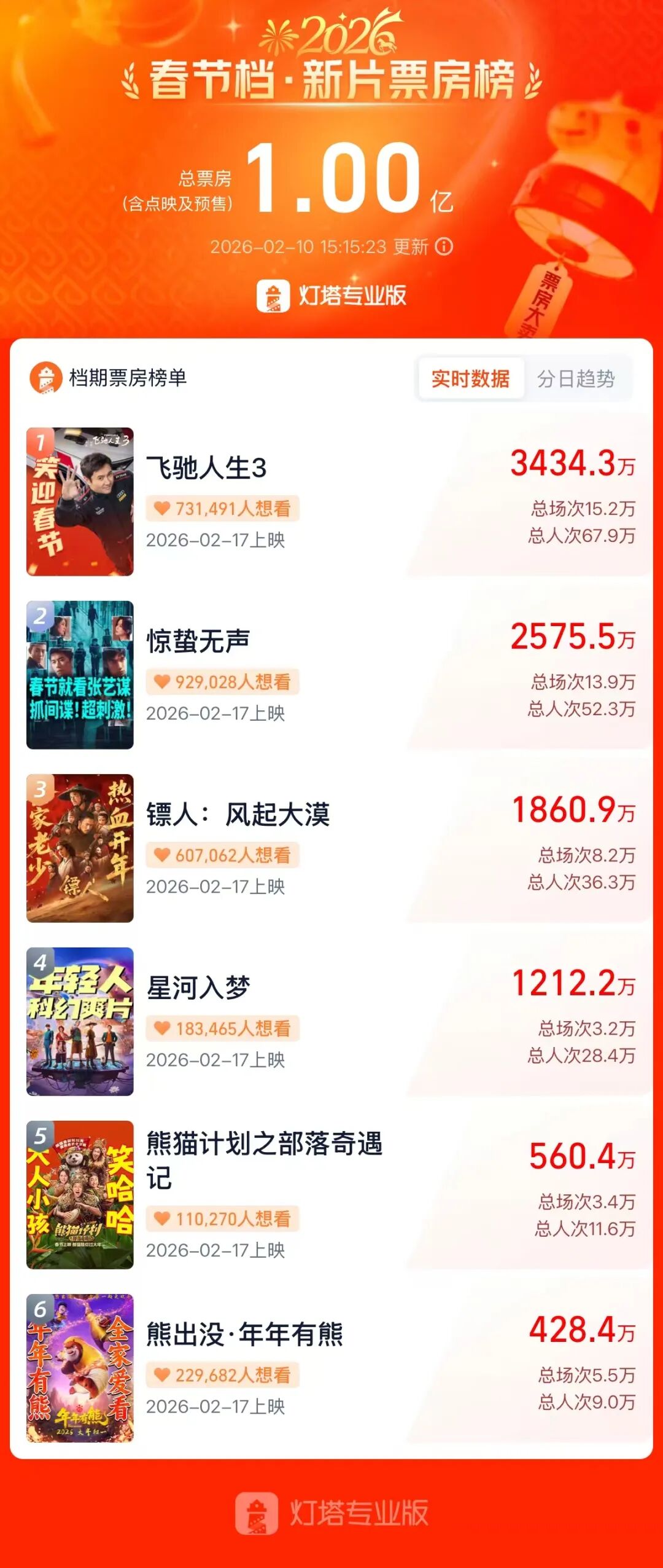 2026年春节档电影预售于2月9日10点正式开启,截至2月10日15点15分,春节档预售总票房(含点映及预售)达到1亿元,市场热度持续攀升。灯塔专业版显示,春节预售票房榜前六名的影片中,横店影视为《飞驰人生3》《星河入梦》《熊出没·年年有熊》这三部影片的出版发行方之一。其中,《飞驰人生3》凭借3434.3万元的预售成绩位居第一。