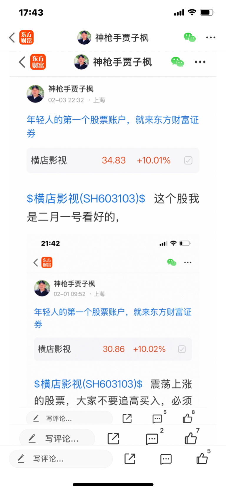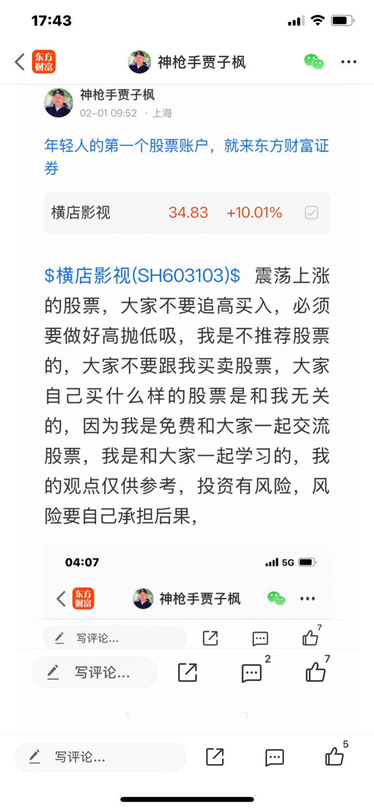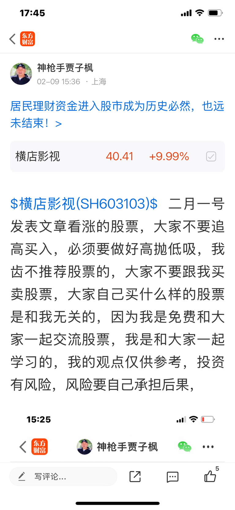 $横店影视(SH603103)$ 这个股我是二月一号发表文章看涨的股票,大家不要追高买入,必须要做好高抛低吸,我是不推荐股票的,大家不要跟我买卖股票,大家自己买什么样的股票是和我无关的,因为我是免费和大家一起交流股票,我是和大家一起学习的,我的观点仅供参考,投资有风险,风险要自己承担后果,