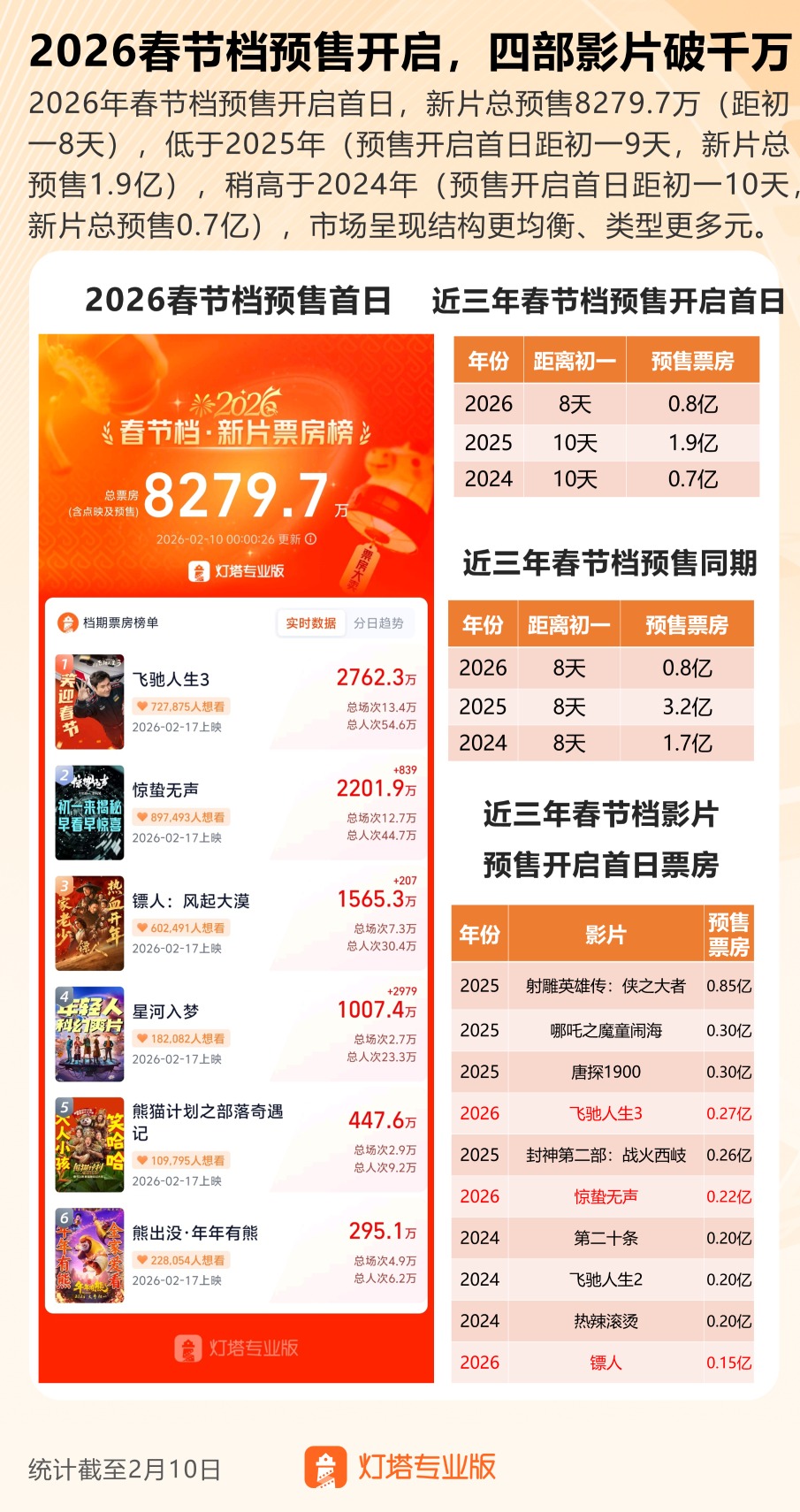 从预售数据可以看出,同比去年一天之内预售票房过亿,今年在预售开启的第二天晚上十点才勉强破亿。虽然今年预售首日票房0.8亿略高于2024年的0.7亿,但是今年预售较晚,距离大年初一8天才开预售,如果同期对比的话,远远不及2025年的3.2亿,以及2024年的1.7亿。