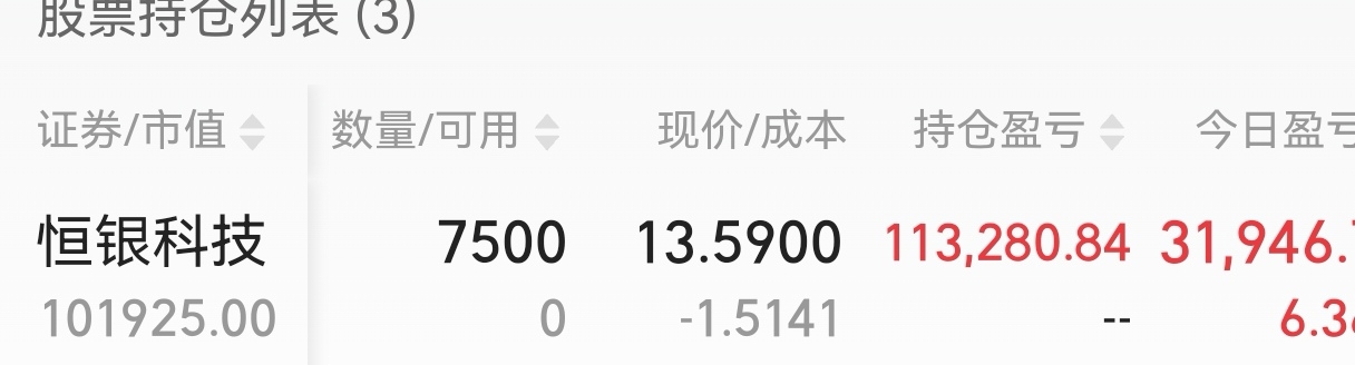 $恒银科技(SH603106)$ 家人们,我的成本为啥是负的了