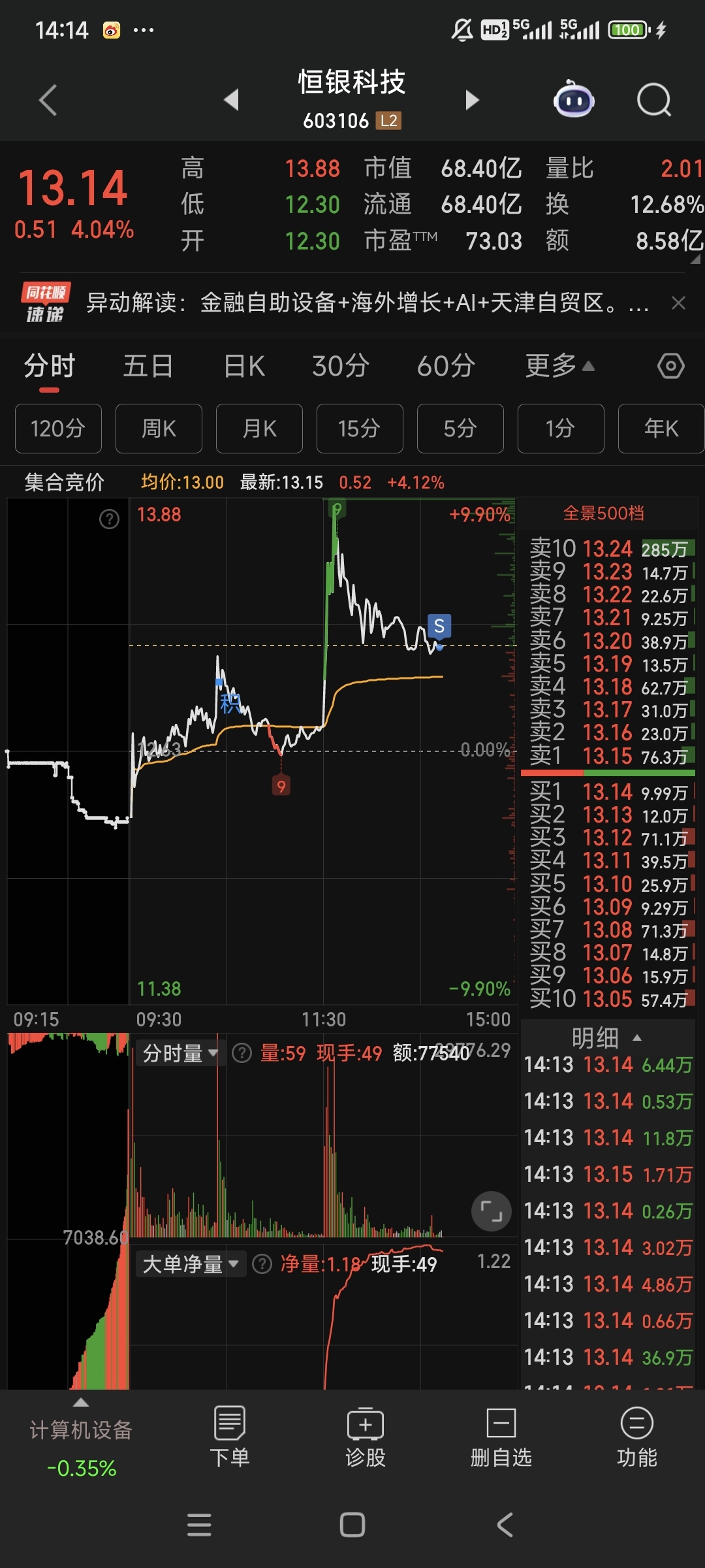$恒银科技(SH603106)$ 没盯盘就是容易错过高点,拜拜啦。