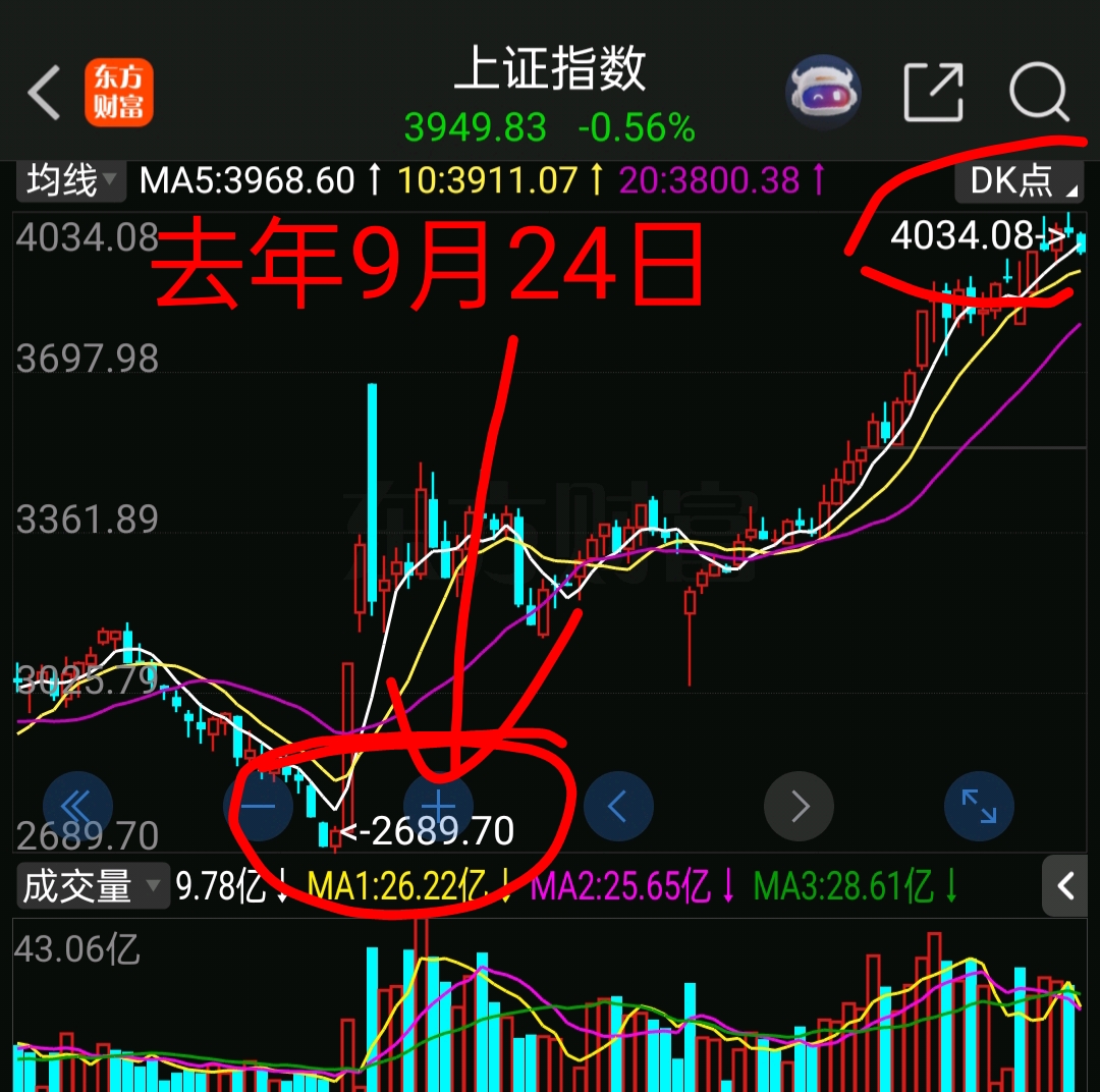 好恐怖,丢人啊,去年924行情以来,去年9月24日大盘2600到现在4000点。