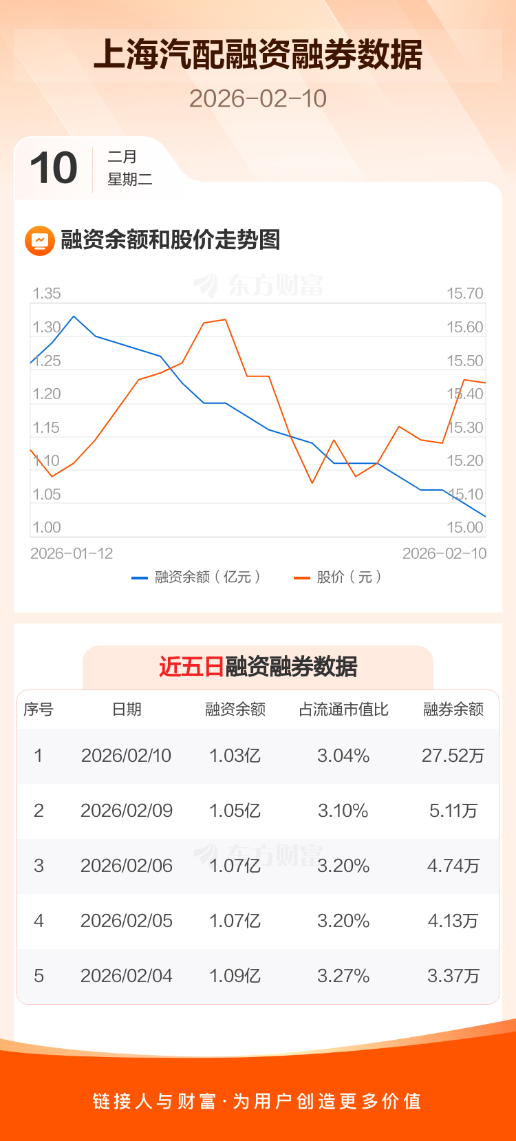 交易所最新数据显示,上海汽配于2026年2月10日获融资买入116.59万元,融资偿还332.42万元,当日融资净偿还215.83万元。目前,该股融资余额1.03亿,占流通市值比例为3.04%。