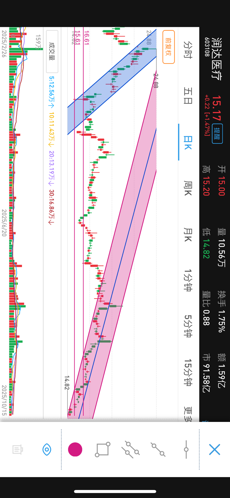 润达预计走的是五浪回调。现在来看为第四浪。明天若开盘拉高15.6为压力位。若继续