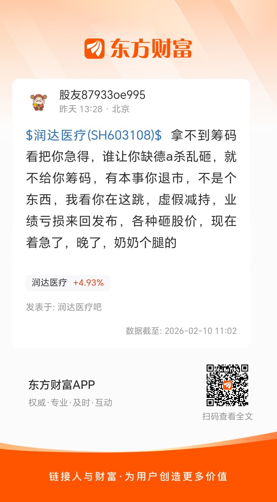 $润达医疗(SH603108)$ 拿不到筹码看把你急得,谁让你缺德a杀乱砸,就不给你筹码,有本事你退市,不是个东西,我看你在这跳,虚假减持,业绩亏损来回发布,各种砸股价,现在着急了,晚了,奶奶个腿的