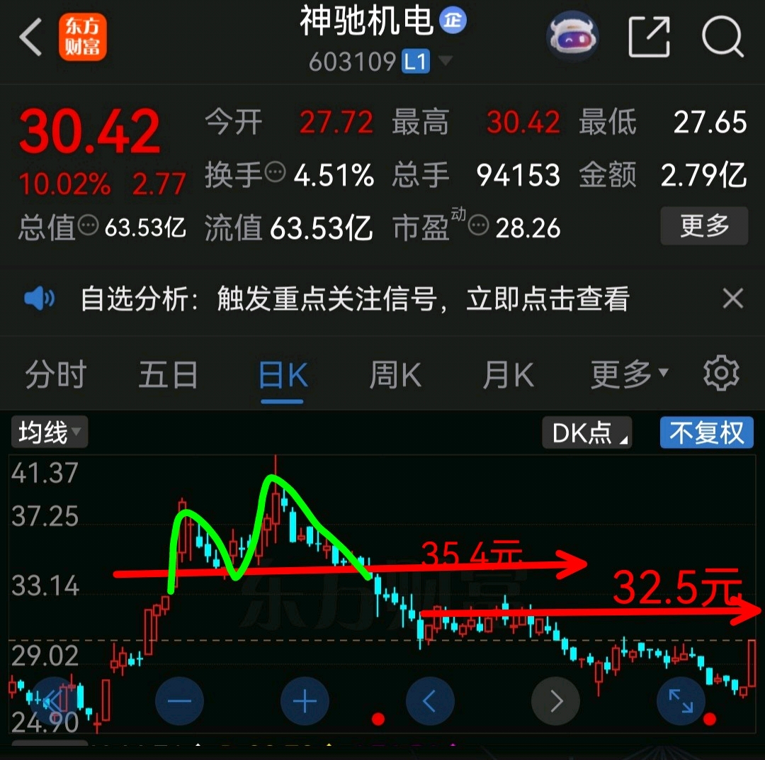 神驰机电注意节奏明天注意开盘情况,如冲高31—32.4元高度不能站稳先出来,回调