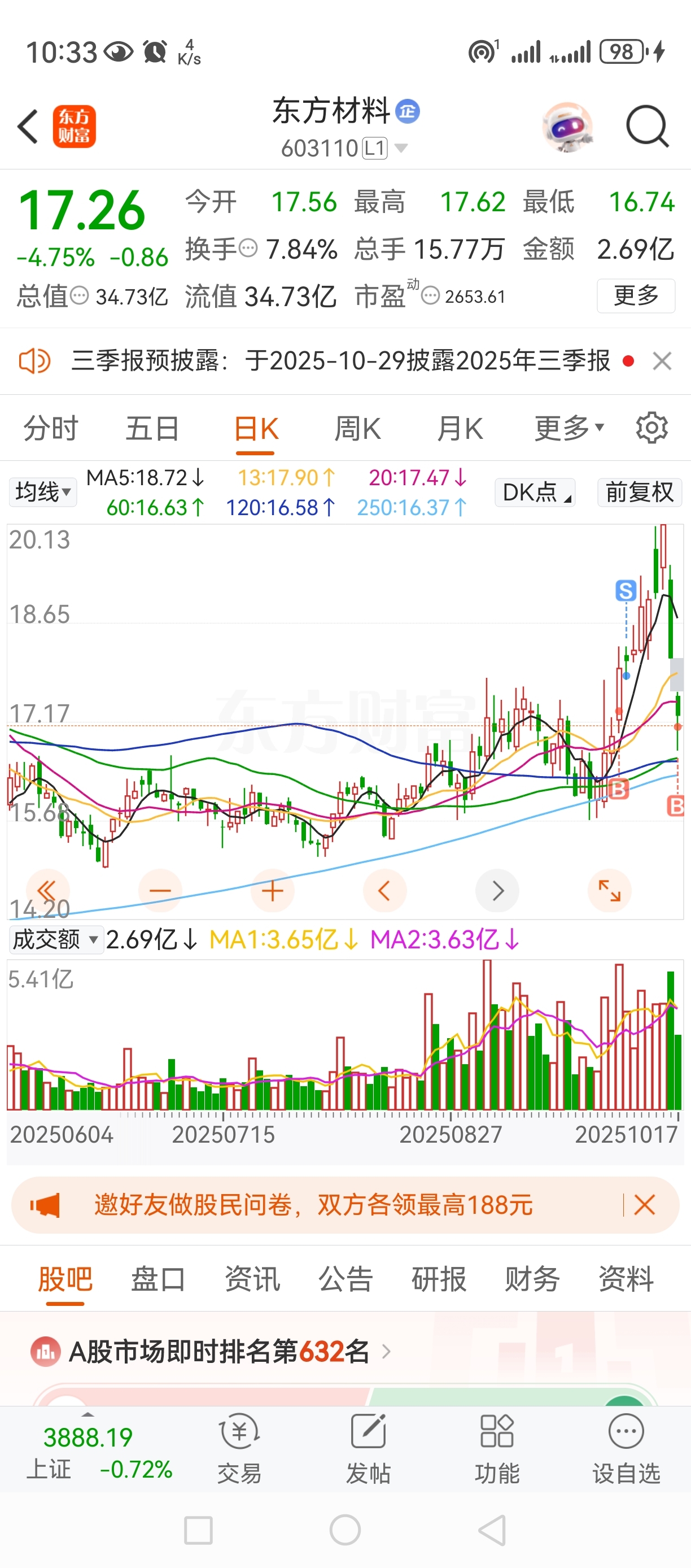$东方材料(SH603110)$ 我又回来躺着啦!有一起的吗