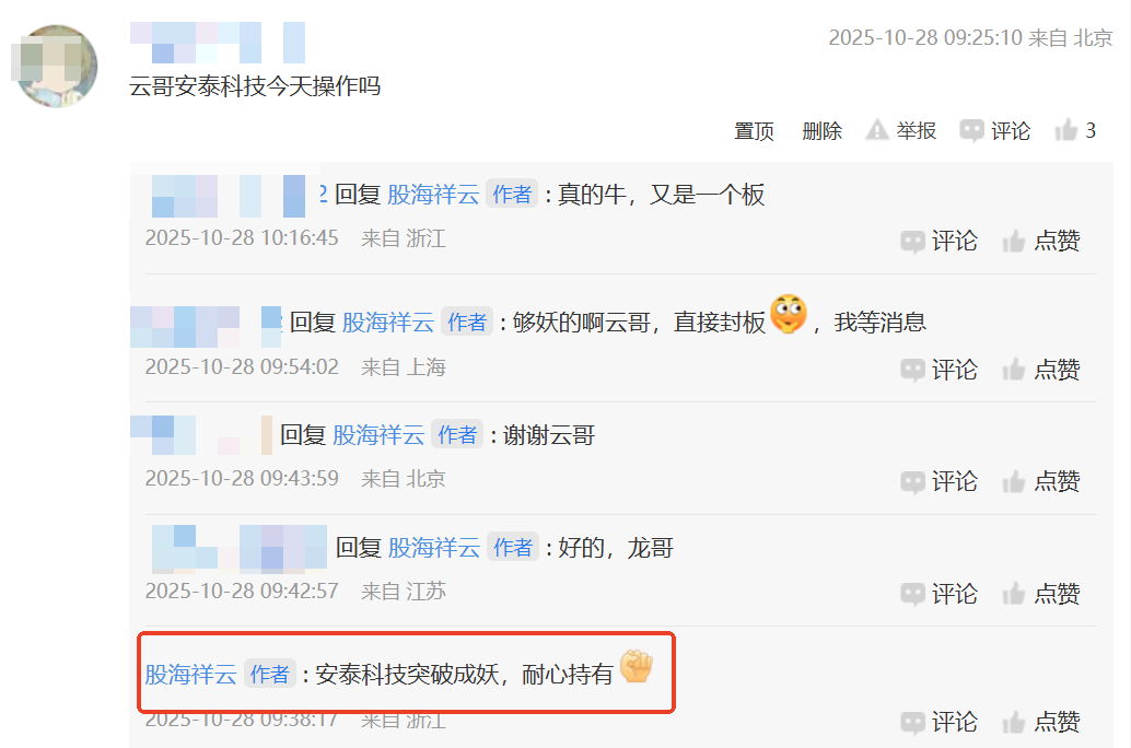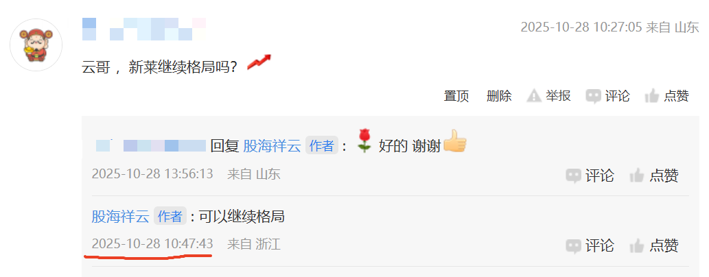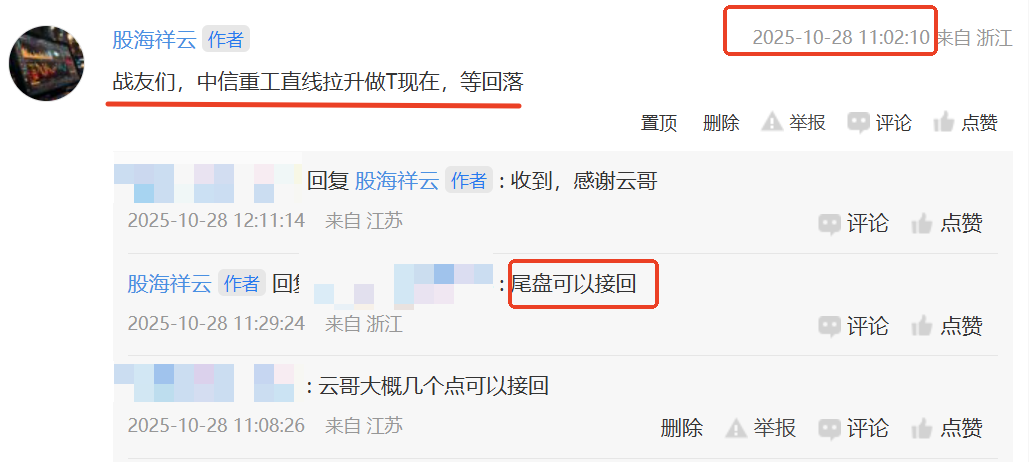 早上云哥就让拿着不动的,很多人问怎么处理怎么处理,后面直线拉升了处理你们又不听,做做T不香吗,开盘被洗出去了的估计又得去追高,不听老人言吃亏在眼前啊,午后继续给回,题材有趋势有那么做差价就是一个不二选择。这票云哥盘中留言区一直强调了尾盘接回来,这就不会接的太高,做交易一定得沉住气啊战友们。