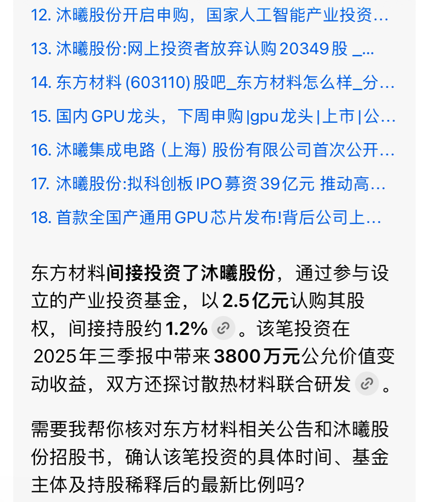 东方材料间接投资了沐曦股份,通过参与设立的产业投资基金,以2.5亿元认购其股权,间接持股约1.2%。该笔投资在2025年三季报中带来3800万元公允价值变动收益,双方还探讨散热材料联合研发