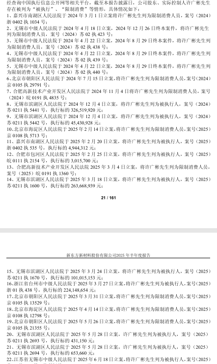 截至2025年6月底,许广彬累计涉及22起 "被执行"" 限制消费 " 相关情形。其中,北京市朝阳区人民法院于2025年5月26日立案,将其列为限制消费人员;无锡市中级人民法院紧随其后,于6月18日立案将其列为被执行人。许广彬涉及的债务纠纷已影响其对上市公司的控制权。
