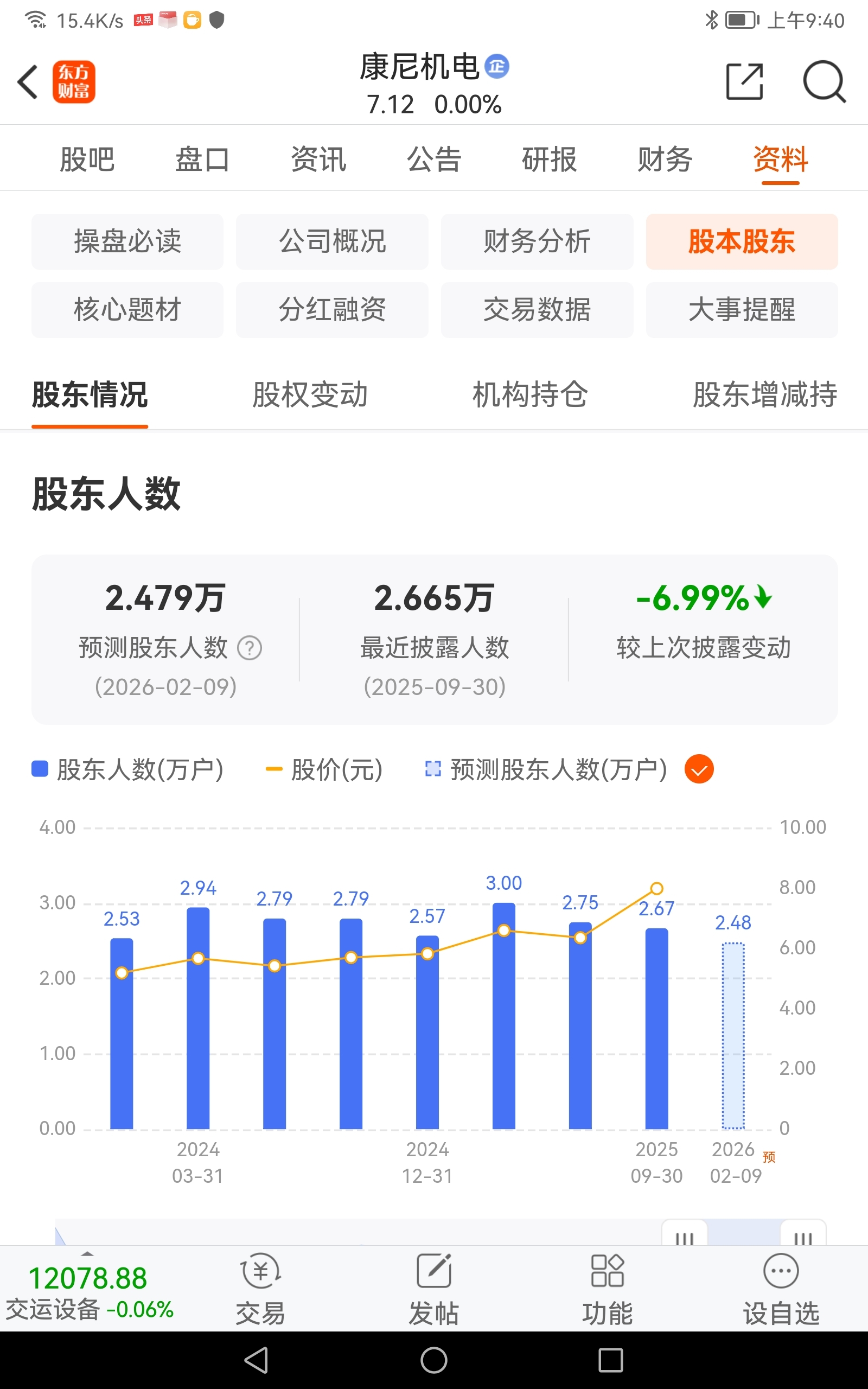 $康尼机电(SH603111)$ 从康尼机电的股东人数变化越来越少来看,这里面有人在收集筹码。一季报,股东人数3万,二季报,股东人数2.75万,三季报2.67万,2月9日东财的预测股东人数是2.48万。