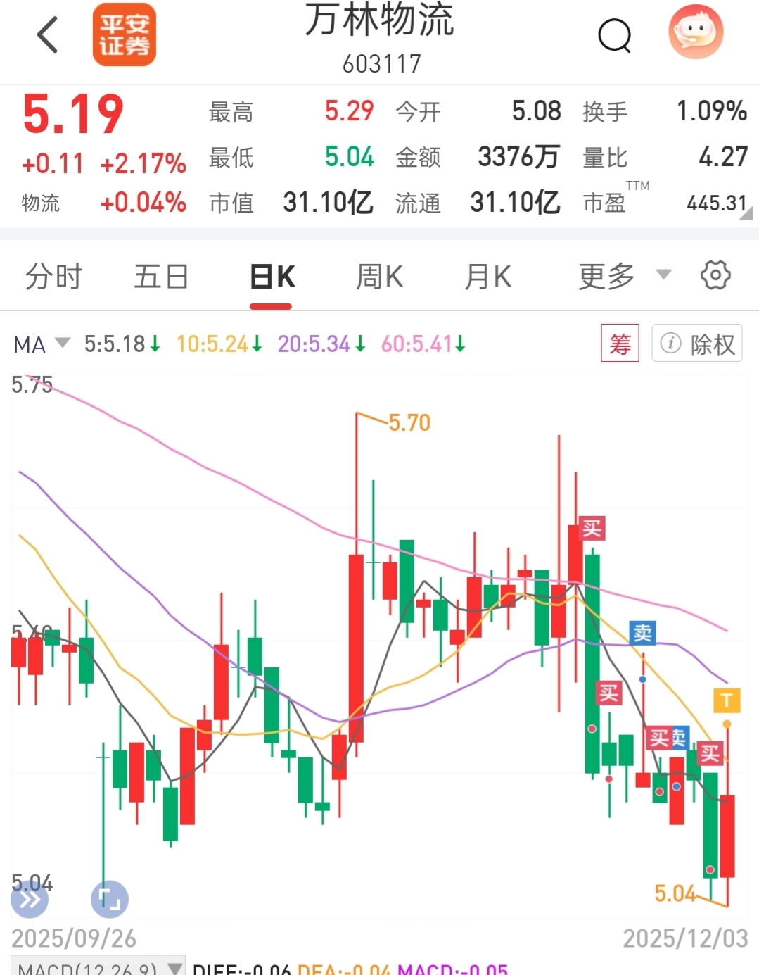 $万林物流(SH603117)$ 小万子,这就是实力,来来回回吃了十来个点了,今天5.07买,5.2卖的,我吃定你了,小万子。